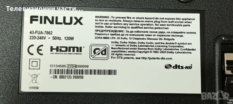 Finlux 43-FUA-7062 със счупен екран VES430QNDH-N2-N42 17IPS72/17MB170/PT430GT01-1-C-3/17DLB43VER14-A