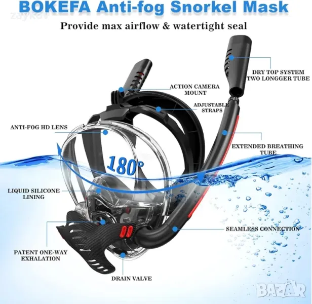BOKEFA Цялолицева маска за шнорхел със закрепване на камерата S/M