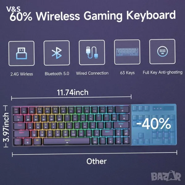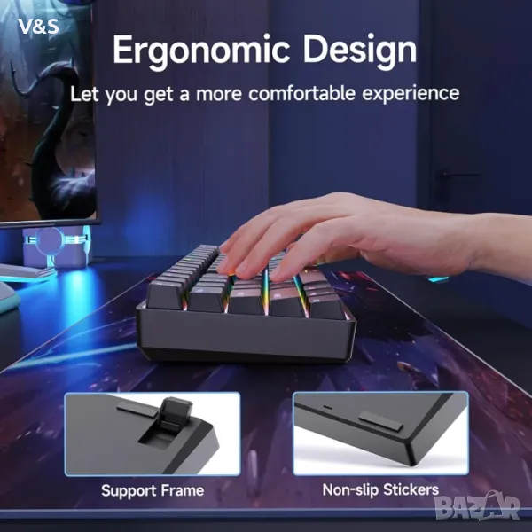 Тази 60% клавиатура има ултракомпактно оформление от 63 клавиша без удар за всички клавиши. Дължината на T63 е само 292 mm (11 инча) и с клавишите със стрелки е по-удобен за работа от други 60% механични клавиатури. Подходящ за всякакви среди, бизнес пътувания, игри, офис, домашна употреба, тъй като неговият мини размер е много лесен за носене.