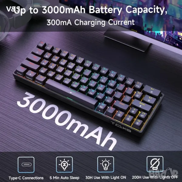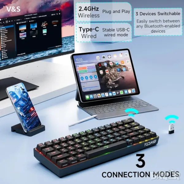 T63 ви позволява безжично да се сдвоявате с до 3 устройства чрез Bluetooth 5.1 или 2.4g, натиснете Fn+N, за да свържете към 2.4g, натиснете Fn+C/V/B, за да свържете към Bluetooth 3 канала. Безпроблемна многозадачност на лаптопи, таблети и телефони. Поддържа операционни системи като Window/Android/Ios/Mac или можете да използвате включения USB кабел Type-C за свързване и всичките ви устройства са под ваш контрол.