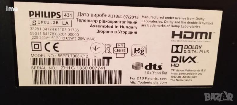 TCON Board ART42/47/55FHD TM240. Свален от Телевизор Philips 55PFL7008K/12