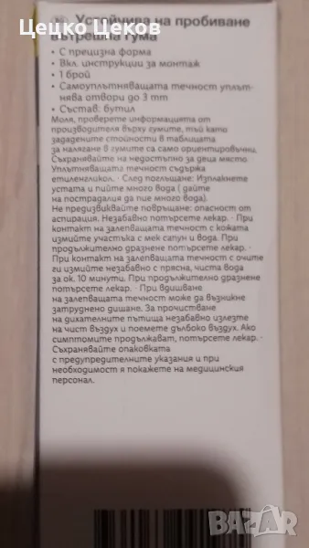 Устойчива на пробиване.Самоуплътняваща течност уплътнява отвори до 3 мм.Състав:бутил.