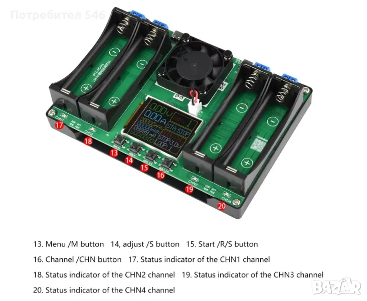 Работно напрежение: DC5V. Подходящ за всички литиево-йонни батерии 18650, които отговарят на изискванията за напрежение на спиране на разреждане от 2,5~3,5V и започващи от 2,8V до 4,2V. Характеристики: 1. Поддържа отделно зареждане и разреждане и поддържа до 9 цикъла на зареждане и разреждане в автоматичен режим. 2. Всички канали са независими един от друг, настройват се отделно, работят независимо и не си пречат. 3. Активно охлаждане на вентилатора поддържа защита от прегряване. Функция зареждане: автоматично прекъсване на зареждането при пълно зареждане (зареждането на желязо фосфатен акумулатор не се поддържа). Функция разреждане: автоматично спиране, когато са изпълнени условията, токът на разреждане не е регулируем. Автоматично зареждане и разреждане: Батерията е напълно заредена в края на автоматичния режим. Циклично зареждане и разреждане: 1~9 цикъла регулируеми (поддържа се само в автоматичен режим). Напрежение на спиране на разреждане: 2.5V, 2.6V, 2.7V, 2.8V, 2.9V, 3.0V, 3.1V, 3.2V, 3.3V, 3.4V, 3.5V - 11 регулируеми стойности. Ток на разреждане: около 1A. Напрежение на зареждане: контролирано от специален чип за зареждане на батерията, с максимален ток на зареждане около 1A и напрежение на пълно зареждане от 4.2V. Имам и по-евтини зарядни за две батерии 18650 на USB Typ C