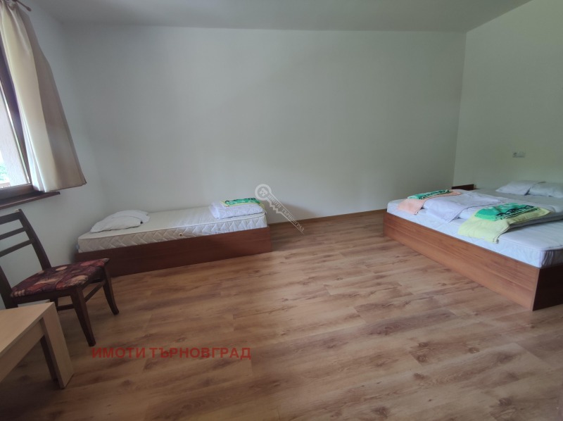 Имоти Търновград Ви предлага страхотна къща за гости в Дряновския балкан, намираща се само на 8 км от град Дряново. Имотът предлага комфортно настаняване в приятна атмосфера. На разположение са девет самостоятелни стаи (капацитет до двадесет човека). Всяка стая се състои от коридор, спалня с двойно и единично легло, санитарен възел, климатик, телевизия, интернет. Разполага с голяма трапезария със зала за хранене с климатик, камина и пълно кухненско обзавеждане, покрита тераса с подвижно барбекю, сауна. Част от отоплението е чрез камина на дърва - с локално парно за три от стаите и трапезарията. Дворното място е с площ 2000 кв. м - отлично поддържано, построен е навес от дървена конструкция и има възможност за паркиране на автомобили. Имотът се намира в живописно селце в Дряновския балкан, предлагащо отлични условия за лов, риболов и парапланеризъм. Имотът се продава с цялото налично обзавеждане и оборудване. Оферта : 11544 - imotitarnovgrad.com