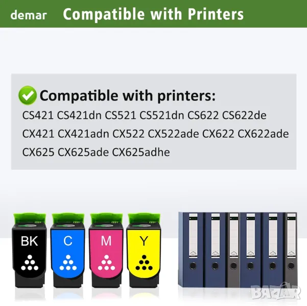 Комплект 4 цвята Съвместими тонер касети CS421 CS521 CS622 CX421 CX522 CX622 CX625. Тази касета може да се използва за подмяна на оригинална тонер касета 78C20K0 78C20C0 78C20M0 78C20Y0 78C2XK0 78C2XC0 78C2XM0 78C2XY0. Стандартен капацитет, черно 2000 страници, код: 78C20K0; Циан 1400 страници, код: 78C20C0; Магента 1400 страници, код:78C20M0; Жълти 1400 стр., код: 78C20Y0. при 5% покритие, хартия A4, letter (ISO/IEC стандарт). Съвместим за принтер Lexmark CS421 CS421dn CS521 CS521dn CS622 CS622de CX421 CX421adn CX522 CX522ade CX622 CX622ade CX625 CX625ade CX625adhe.
