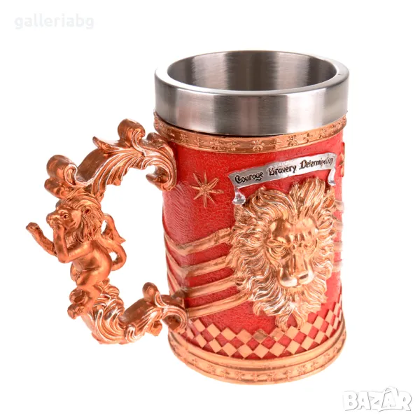 Стилна и тежка чаша, вдъхновена от дома Gryffindor в Хогуортс. Богат релеф, златисти орнаменти, надпис „Courage – Bravery – Determination“ и класическата емблема с лъв. Метална вложка отвътре, подходяща за топли и студени напитки. Изключителна находка за фенове на Harry Potter!