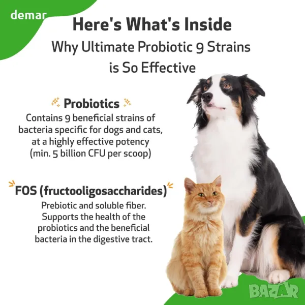 Подобрете качеството на живот на вашия домашен любимец с тази формулирана от ветеринарен лекар добавка, включваща девет пробиотични щама и пребиотици за балансирана чревна флора, насърчаване на здравословно храносмилане, правилно елиминиране и имунна подкрепа. Разработен от холистични ветеринари, той поддържа здравето на пикочните пътища и цялостното благосъстояние. Произведено в САЩ в регистрирани от FDA, GMP сертифицирани съоръжения с висококачествени, тествани съставки.