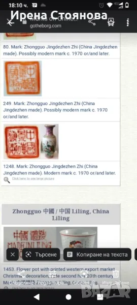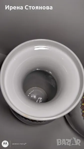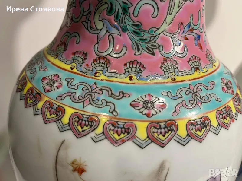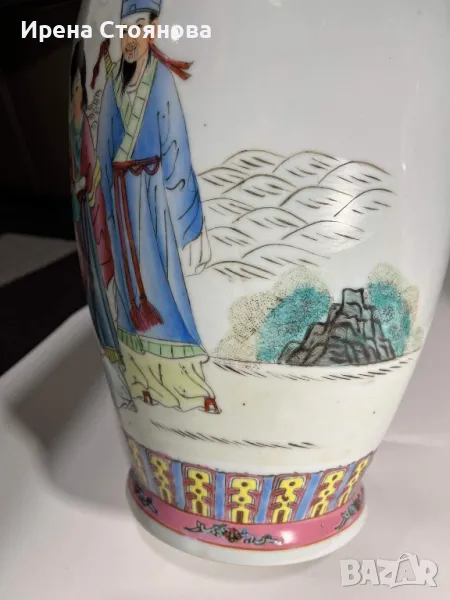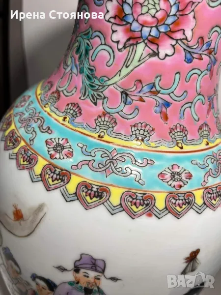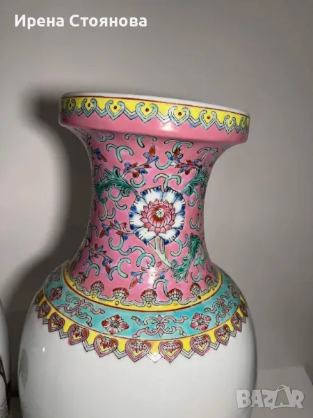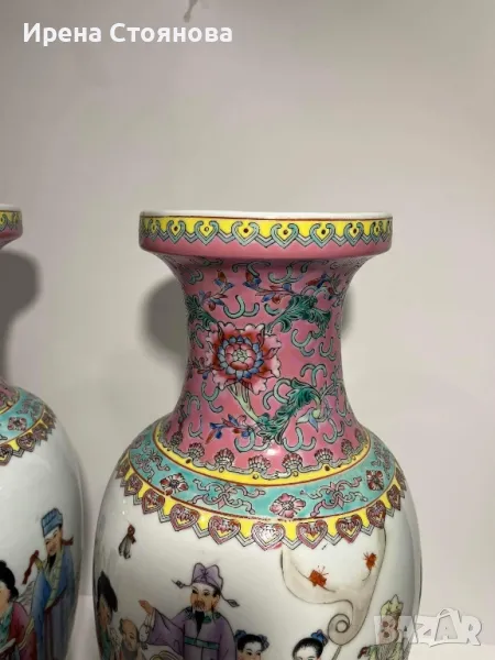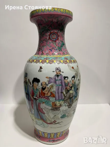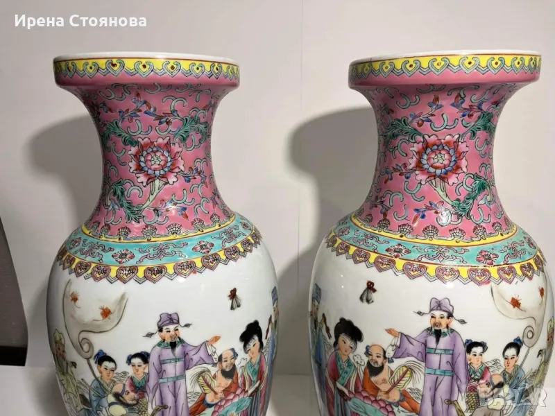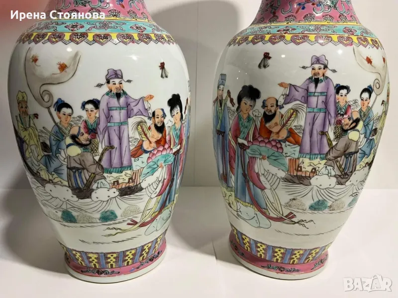 Двойка големи, китайски, порцеланови вази Qianlong Famille Rose Mandarin. Маркирани за произход, Zhongguo Jingdezhen Zhi China датирани около1970 година. Famille Rose са група китайски порцеланови изделия, характеризиращи се с декорация, боядисана в непрозрачни надглазурни розови цветове, главно нюанси на розово и кармин. Тези цветове са били известни на китайците като yangcai („чужди цветове“), тъй като за първи път са въведени от Европа (около 1685 г.). По времето на царуването наYongzheng (1722–35) по време на династията Цин (1644–1911/12), тези нюанси са предпочитани пред полупрозрачните фамилни верте надглазурни цветове, които са били използвани преди това.Вазите са ръчно изработени и изрисувани огледално, отпред са изобразени " 8-те безсмъртни пресичащи морето в лодка", а отзад калиграфия на стих.8-те безсмъртни се считат за патронни богове на Дао религията.Представители на популярните индивиди в обществото и символизират богатсвото и нищетата, старостта и младостта, мъжеството и женствеността. Китайците вярват, че обикновения човек може чрез усърдно изучаване да усвои тайните на Природата и да добие безсмъртие.Размери височина 47 см, диаметър на основа 15 см, диаметър на отвора 15,5 см и диаметър в най-широка част приблизително 22-24 см. Всяка една тежи 2670 грама. В перфектно състояние! Единствено притежават несъвършенствата на ръчна изработка! Пазили дълги години къщата на една австрийска дама, ценяща японското и китайско изкуство. Използвани само със сухи цветя, без следи на употреба с вода и остатък от варовик!Продават се в комплект! Но, ако има желаещи за двете поотделно, бих могла да разделя!Цена за брой 350 лв. В комплект 650 лв.