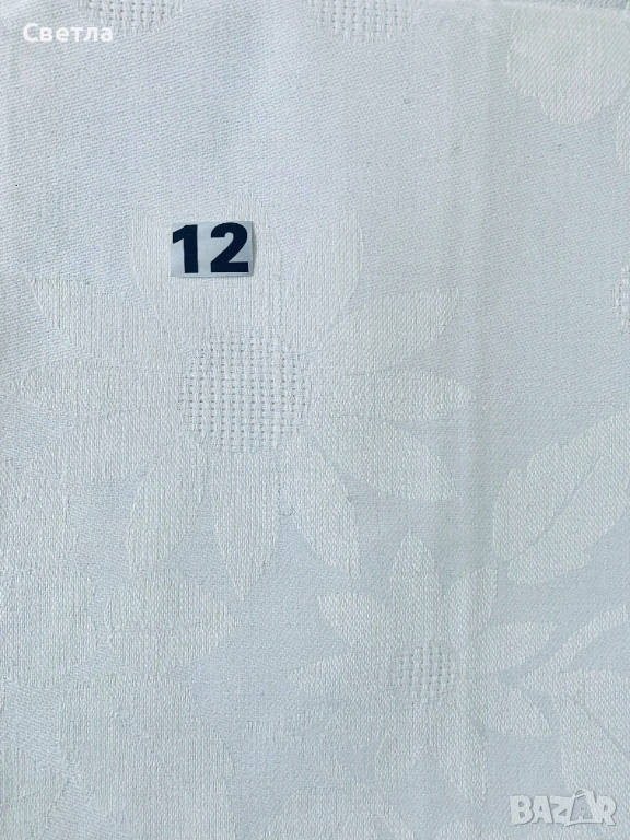 12.Лен Бял, с размери по 1,40/2,50м. и 12 броя ушити салфетки 0,43/0,43м, за които е вложен още 2 метра плат. Общо за комплекта 4,60м., за 117 лв;