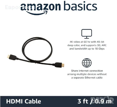 Amazon Basics 4K HDMI кабел 0.9 метра, мъжки към мъжки, 18Gbps висока скорост с Ethernet, 4K@60Hz, 2160p.