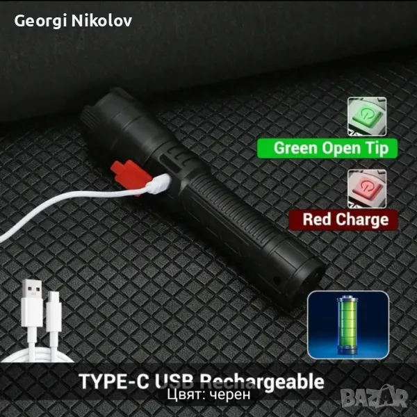 P900 LED Фенер - Тактически презареждащ мащабиращ фенер с 800mAh литиева батерия, USB Кабел тип C.