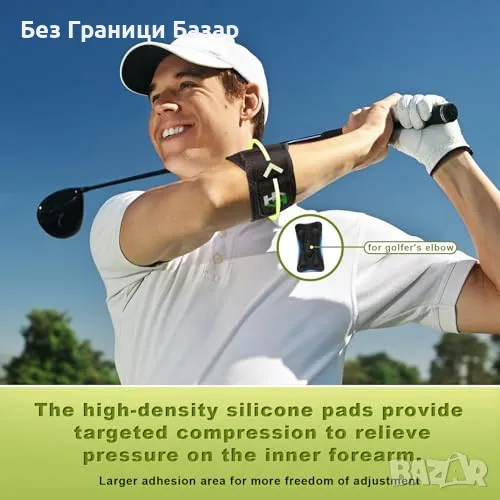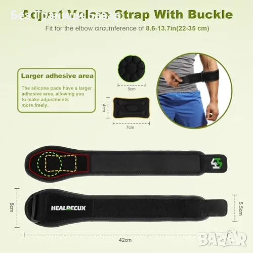 Включва кръгла подложка за тенис лакът и квадратна за голф лакът.
