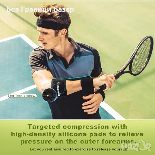 Подкрепя лакътя с компресия за бързо възстановяване и намаляване на умората.