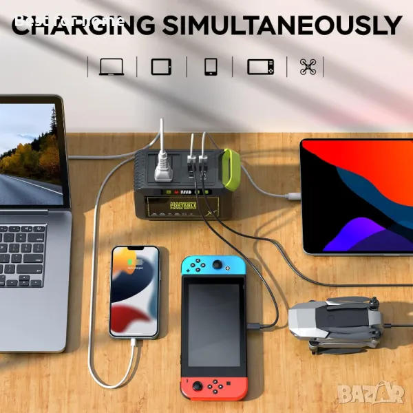 МУЛТИ-ИЗХОД: Преносимата електроцентрала, оборудвана с капацитет 88Wh (24000mAh, 3.7V), 2*QC 3.0 USB порта (18W макс.), 2*USB порта (5V 2.4A), 1*USB C порт (PD2. 0.18W) макс). 1*DC порт (12-16.8V / 10A, 13A макс.), 1*2 полюсен и 1* 3 полюсен изходен контакт (80W работа, 120W пик). Захранва мобилен телефон, iPad, таблет, камера, радио, захранвана от USB нощна лампа, мини вентилатор и скенери за къмпинг под 80 W.