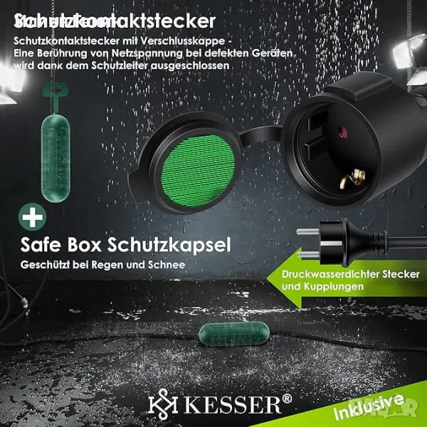 Високо качество: Висококачественият кабел от KESSER е най-доброто решение, когато става въпрос за безкомпромисно захранване. Възползвайте се от изключително високата гъвкавост и особено високата устойчивост на атмосферни влияния. Оборудван със защита от пръски вода съгласно IP44 и защита от прегъване, можете лесно да използвате разклонителя при температури от -20°C до +60°C.