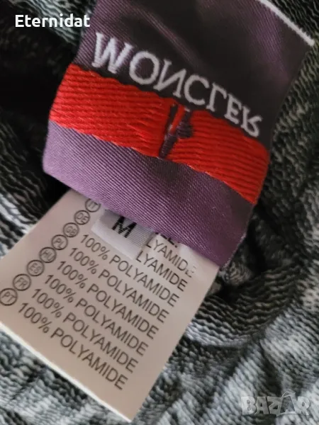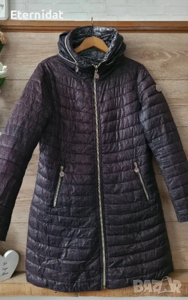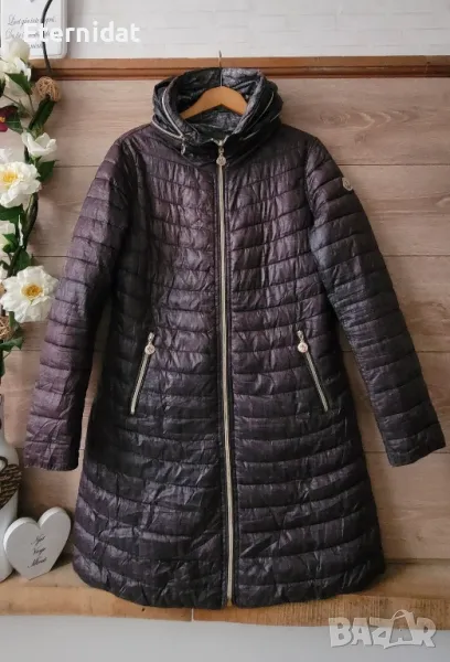 Двулицево яке с качулка ( прибира се в яката) на марката MONCLER. Едното лице е в много интересен преливащ цвят ( вижда се от снимките). Другото лице е в черно/ бяло . Лого на марката на ръкава и на всички ципове. Джобове и на двете лица. Олекотено и топло с пух. Размер М. Дължина 90см, гръдна 98/100см Реална цена над 300лв Моята е 50€