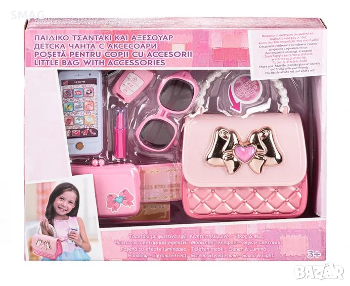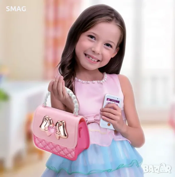 Играчка за момиче, розово портмоне със светлинни ефекти, мобилен телефон със светлина и звук, слънчеви очила, портфейл, банкови карти, ключове за кола и червило. Споделете любимите си тайни и съвети за красота с приятелите си. Вие решавате какво е мода. Мобилният телефон и