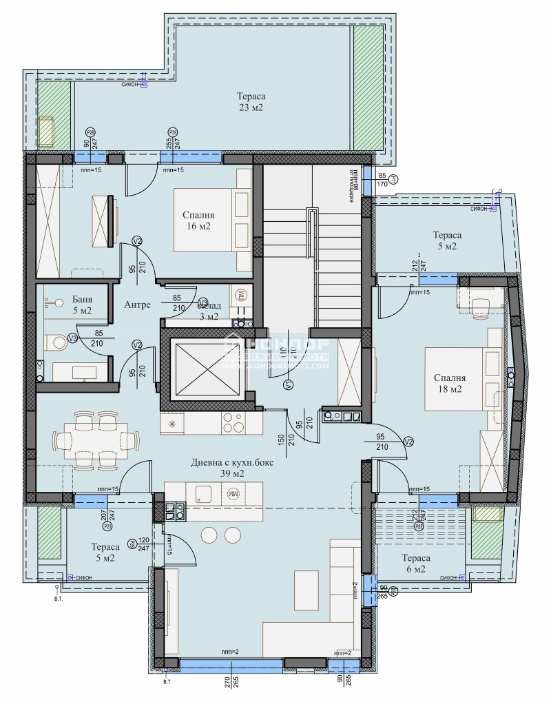 Оферта 64959: БУТИКОВА СГРАДА- 9 АПАРТАМЕНТА! АКТ 16 !!! Предлагаме Ви възможността да закупите тристаен апартамент в луксозна жилищна сграда с модерна визия, проектирана да създаде максимален комфорт на живущите в нея. Основната концепция e премиум строителство, отличаващо се със съвременен архитектурен дизайн и европейска визия. Едно от основните предимства е прекрасна локация в тих и спокоен район с много зеленина и отлично изградени комуникации, в близост до Novotel Plovdiv и на пешеходно разстояние от Центъра на града. Жилището е ситуирано на целия 6-ти последен етаж и има асансьор който обслужва имота с директен достъп. Апартамента се състои от ЮЖНА дневна с трапезария и кухненски бокс- 39 кв.м , спалня- 18 кв.м , втора спалня- 16 кв.м , баня с тоалетна, отделно втора тоалетна, четири тераси и антре. Изключителна съвременна архитектура и модерна технология на строителство. Визията е иновативна, привличаща внимание с уникалността си. Възможност за закупуване чрез банков кредит на изключително изгодни условия за клиенти на агенцията !!!