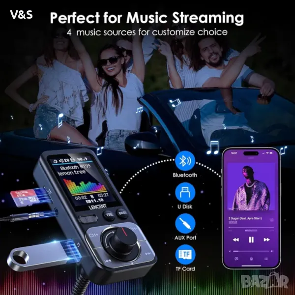 【Двойни USB портове и QC3.0】Bluetooth FM предавател LENCENT с двойни USB портове (QC3.0+2.4A) ви позволяват да зареждате 2 устройства едновременно и осигуряват високоскоростно зареждане на водача и пътника. Портът за бързо зареждане QC3.0, който може да зарежда вашето устройство до 4 пъти по-бързо от стандартното зареждане, ви спестява много повече време от средното. Други портове като слот за TF карта, AUX порт ви предлагат множество възможности за избор, така че можете да изберете да възпроизвеждате музика чрез USB устройство/TF карта/AUX/Bluetooth. (включен е AUX кабел)
