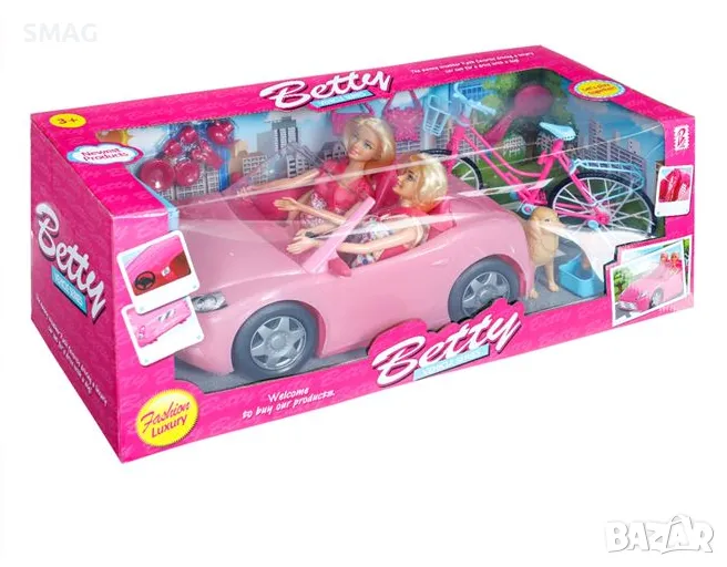 Играчка за момиче, розов кабриолет с 2 кукли с дълга руса коса. Съдържа 1 розов велосипед с кошници, 1 малко и 1 голямо куче, 1 четка, 2 портмонета и аксесоари за храна и чай. Затегнете предпазните колани и пътуването започва в любимата ви луксозна кола.
