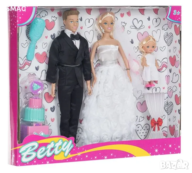 Двойка кукли манекени. Булката носи дълга сватбена рокля без презрамки с рози, сребърен колан и държи розов букет. Младоженецът носи черен костюм с папийонка. Шаферката е в бяла рокля, подарък и двуетажна торта, за да почерпи своите гости.