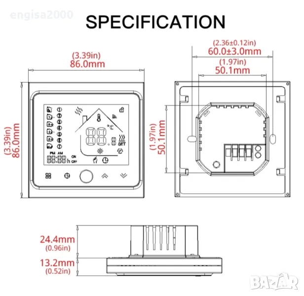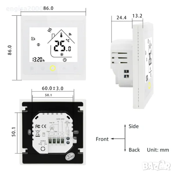 Стайният термостат е подходящ за инсталация в стандартна 86-милиметрова или европейска 60-милиметрова конзолна кутия.
