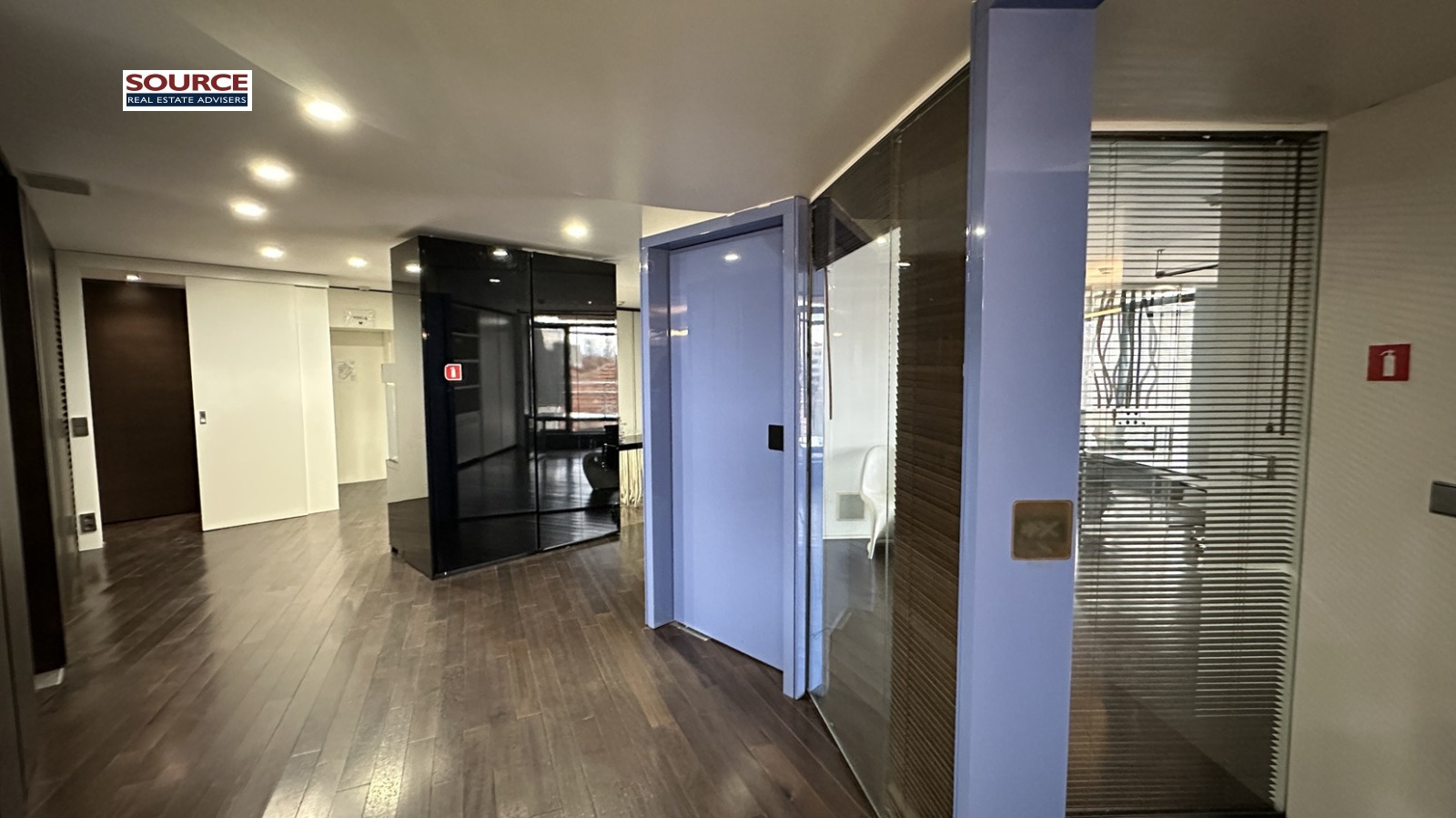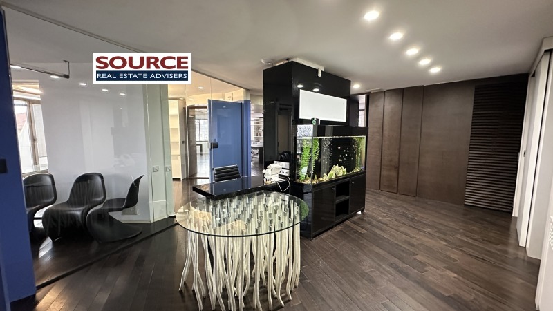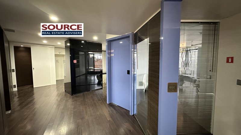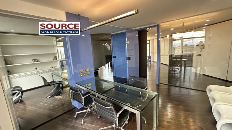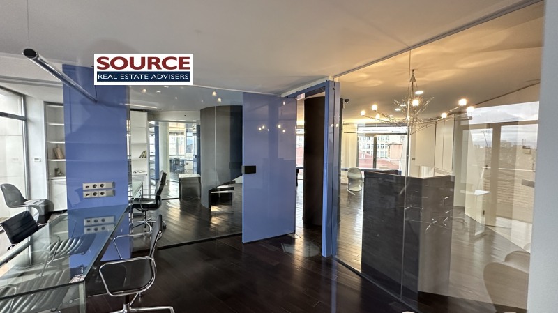 2. Разпределение: 2 големи Open space помещения, 8 отделни работни помещения преградени със стъклени и гипсокартонени стени, представителна рецепция, кухня с трапезария, сървърно помещение с отделна климатизация, 3 wc, 3 тераси. Офисът може да бъде допълнително преграден. Офисът е разположен на 3 етажа свързани с помежду си. На последният етаж на офиса има огромна панорамна тераса която не е включена в указаната площ и е бонус.