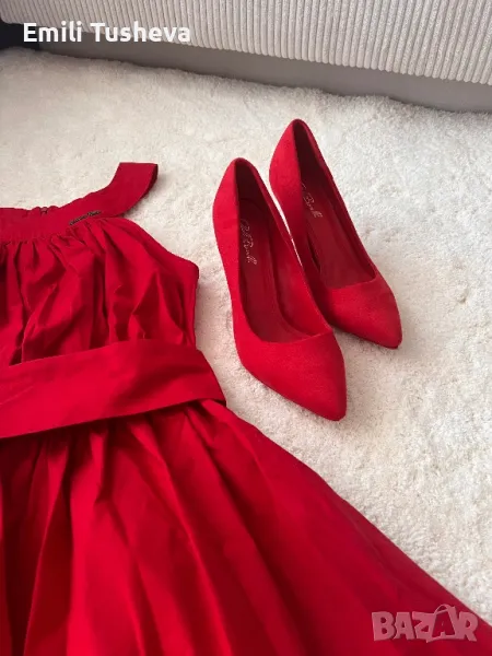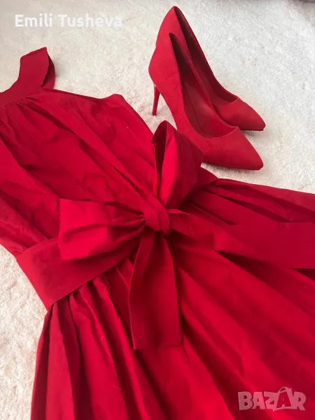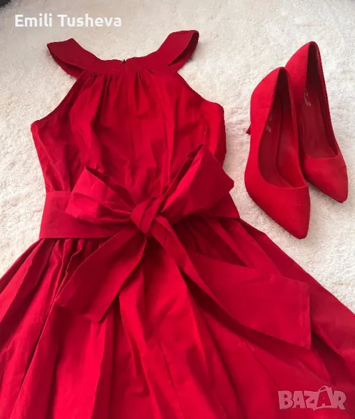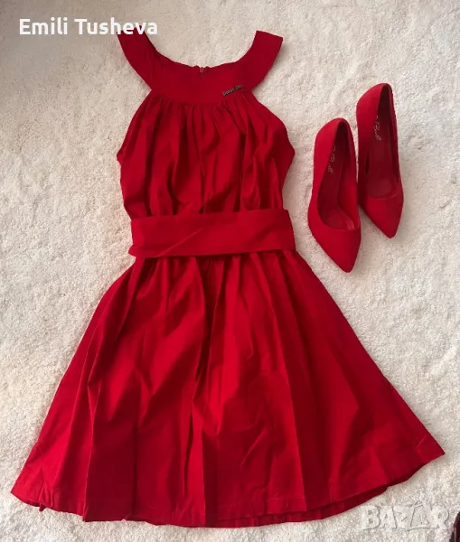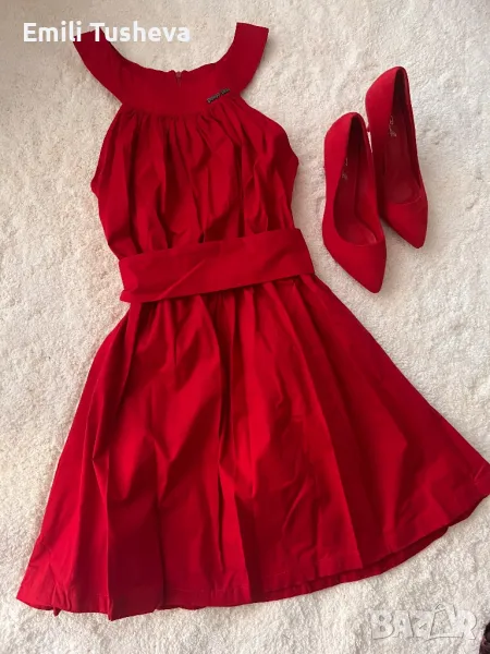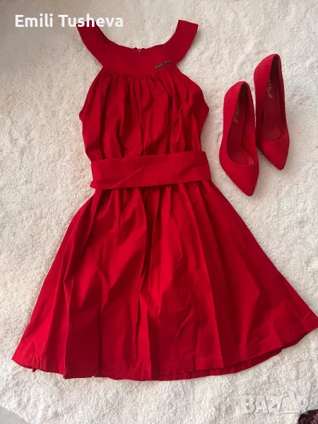 Дамска рокля в червено на PHILILL PLEIN . С колан на кръста.Размер S. Обувките също се продават. Размер 37. Чисто нови са.Цената им е 30.00
