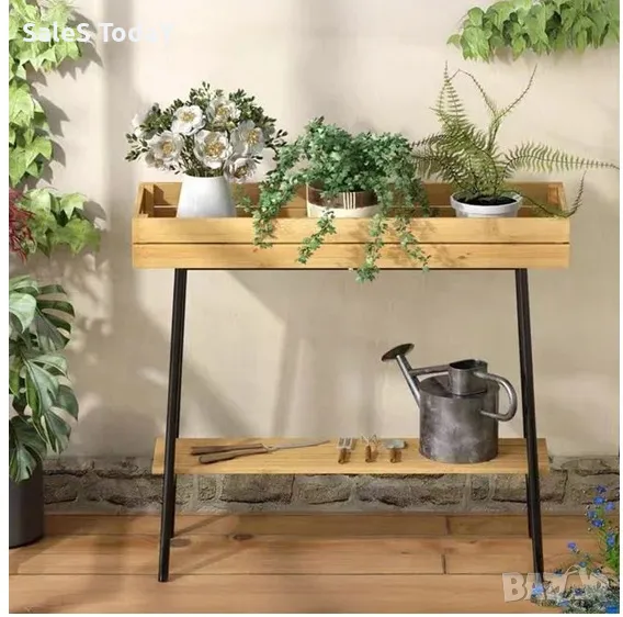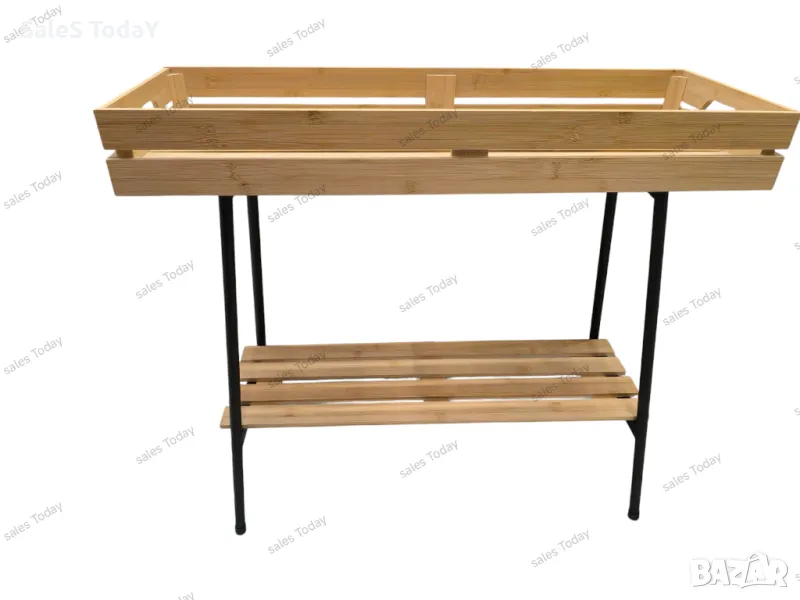 Поставка за цветя с черна метална рамка и 2 рафта от бамбуково дърво в естествен цвят. Горният рафт е с размери 74х25х8см, а долният 65,5х20см с разстояние между 2-та рафта 37см. Поставете го навсякъде на вашия балкон или градина и поставете любимите си растения и цветя. Можете да поставите всяка саксия, за която се грижите, тъй като на долния рафт можете да поставите необходимите градински инструменти или вашата лейка.Материал на продукта