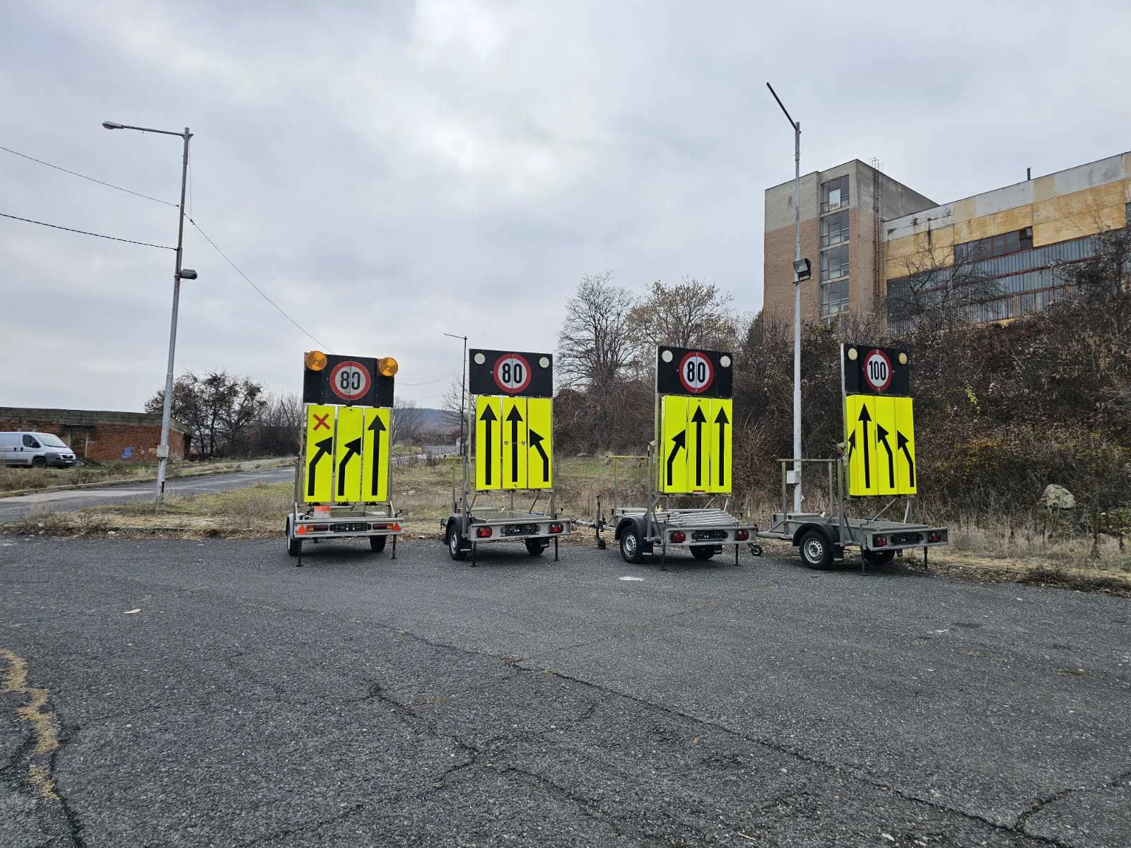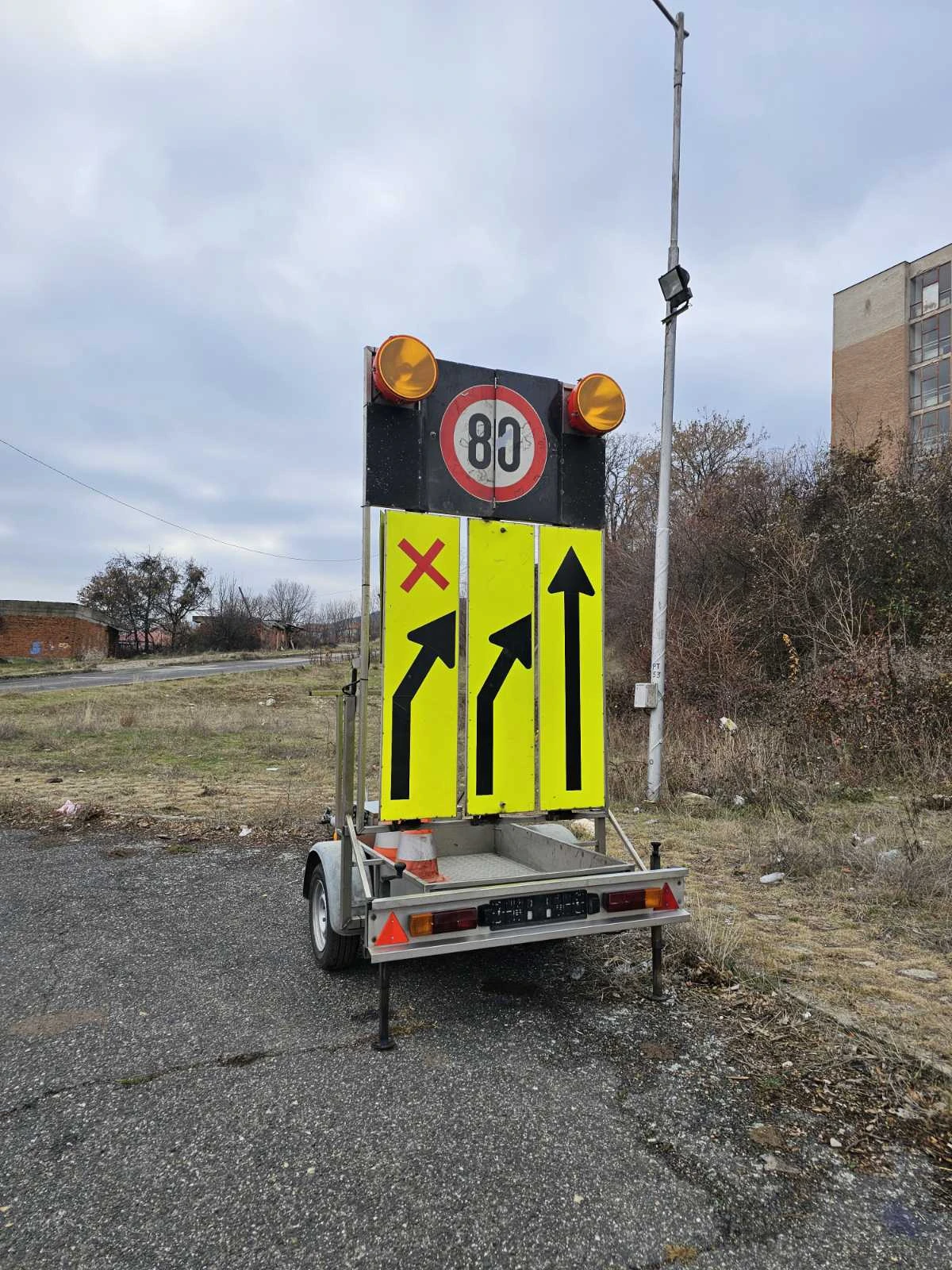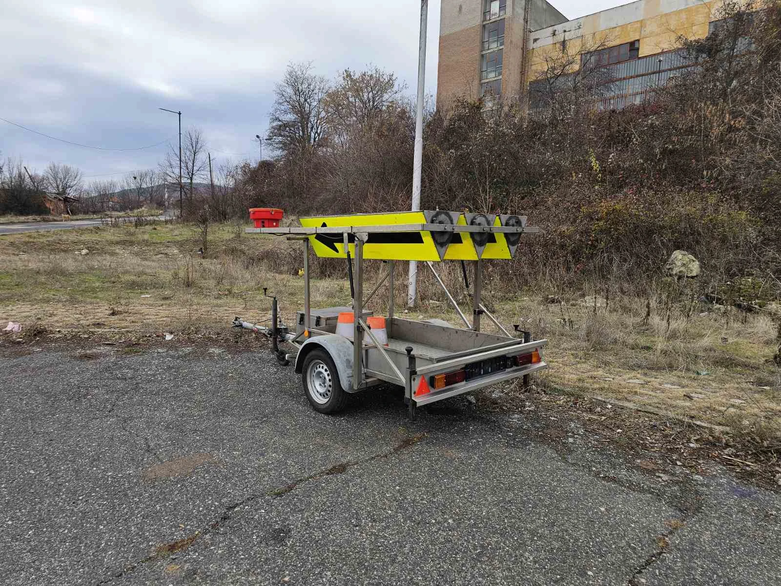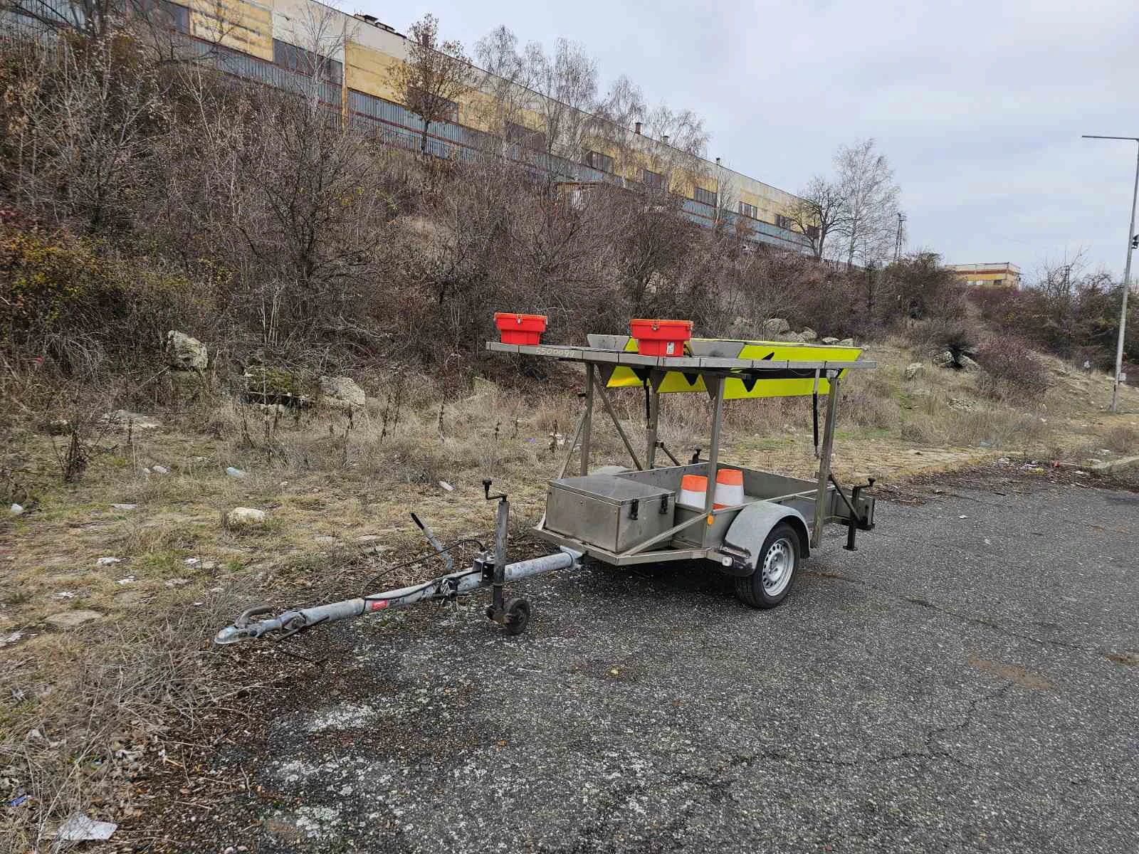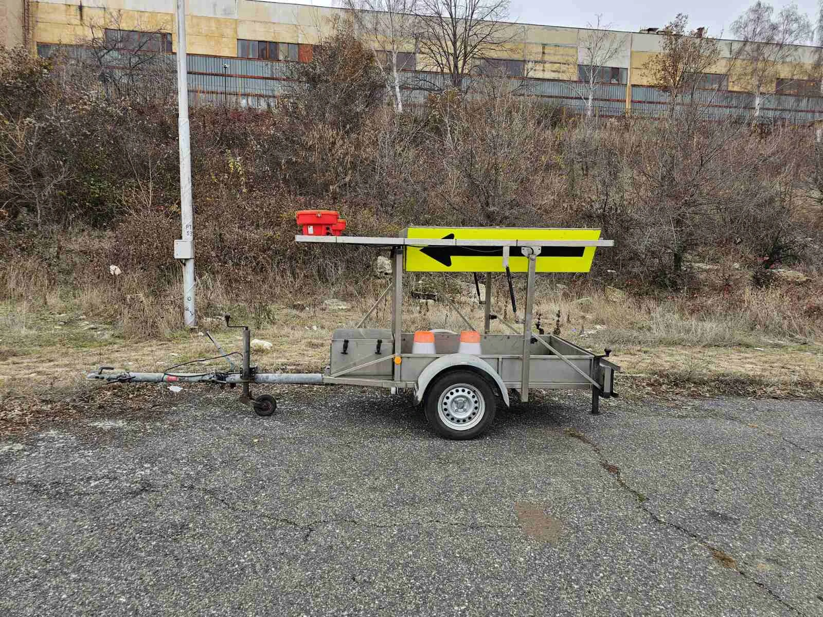 РЕМАРКЕ ЗА ВРЕМЕННА ОРГАНИЗАЦИЯ НА ДВИЖЕНИЕТО Нов внос . Отлична състояние. Ремаркето е поцинковано. Всичко работи перфектно. 430 кг- собствено тегло 750 кг- общо тегло 320 кг- тегло на товар 1050 кг- натоварване на оста Тегличът се наглася от 2 места. Може да се дърпа с В /Б категория. 185/65 R14C- размер на гумите Гумите са на 90%. Батерия+зарядно за 220V за мрежата.