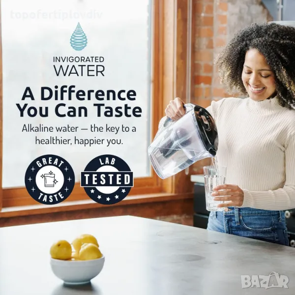 Всяка стомна с алкален филтър Invigorated Water може да филтрира до 2,5 L наведнъж, идеална за дома и офиса. Неговият алкален филтър издържа до 360 литра/96 галона вода.