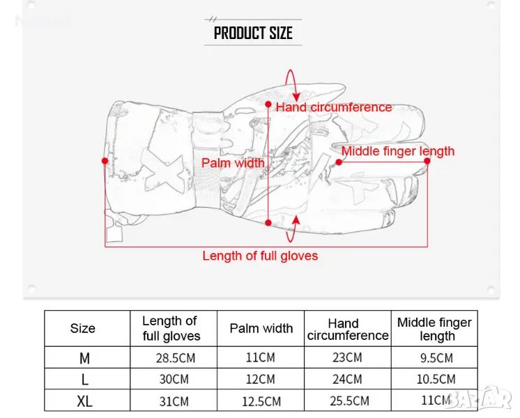 Чифт топли зимни ръкавици, подходящи за ски, сноуборд, туризъм, лов и излети в планината, а и не само. Предотвратяват навлизането на сняг и вода. Водоустойчива и дишаща материя. Пристягащи ластици в горната част, както и ленти за регулиране. Джоб за ски карта.