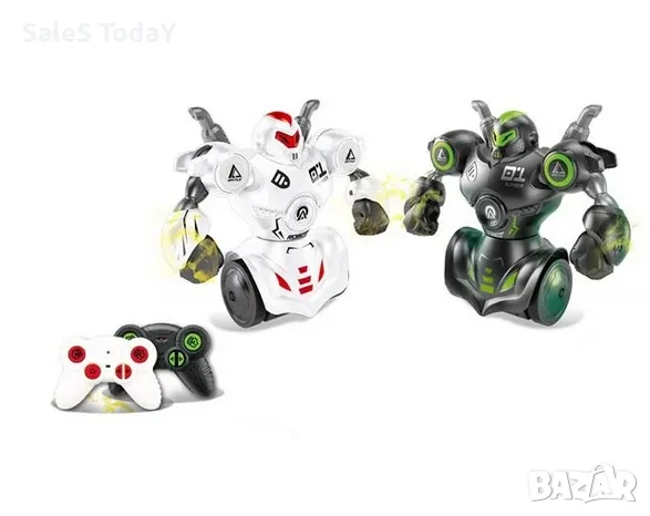 Робот битки с 2 робота, черен и бял. Имат бойни звуци, светлини и светещи очи. С 5 функции и комбинации от движения предизвикайте противника за гигантски битки. Захранва се от 3 AA батерии за всеки робот (не са включени) и 2 AAA батерии за всеки контролер (не са включени).Подходящост за възрастта