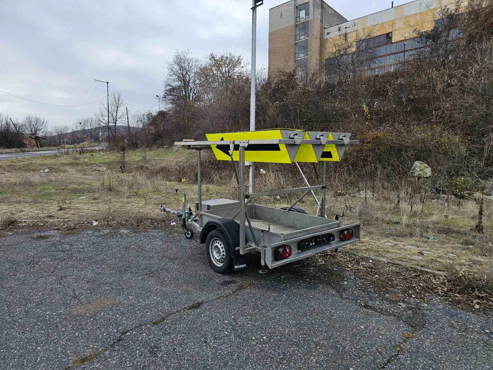 РЕМАРКЕ ЗА ВРЕМЕННА ОРГАНИЗАЦИЯ НА ДВИЖЕНИЕТО Нов внос . Отлична състояние. Ремаркето е поцинковано. Всичко работи перфектно. 430 кг- собствено тегло 750 кг- общо тегло 320 кг- тегло на товар 1050 кг- натоварване на оста Тегличът се наглася от 2 места. Може да се дърпа с В /Б категория. 185/65 R14C- размер на гумите