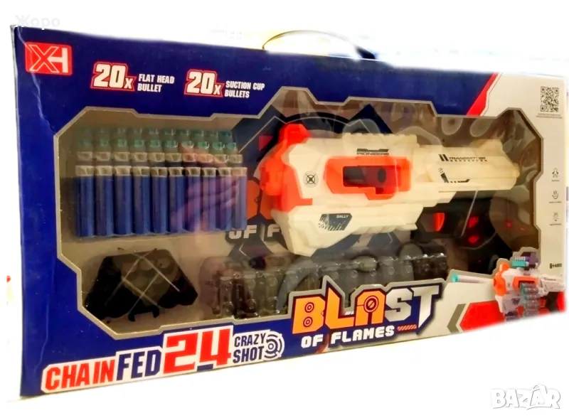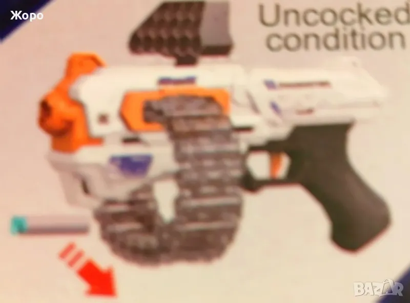 Комплектът съдържа пистолет и 60 гумени стрели с пластмасови върхове абсолютно безопасни