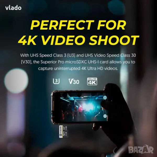 Скоростта на запис е 15-30 mb/s (в зависимост от размера на паметта). Рейтинги на скорост UHS, U3, Class 10 и A2 за най-добро смартфон изживяване