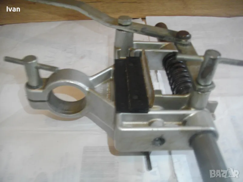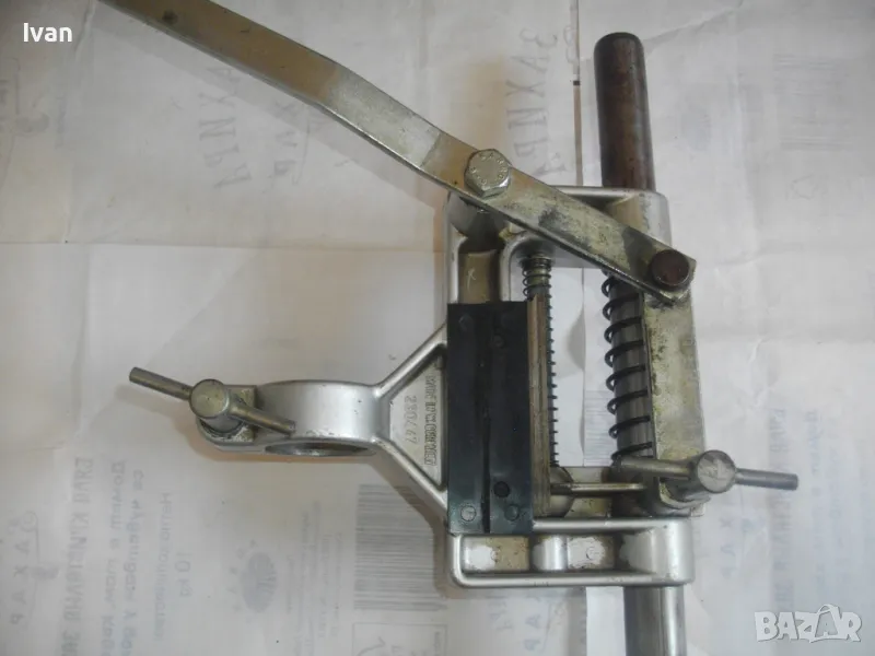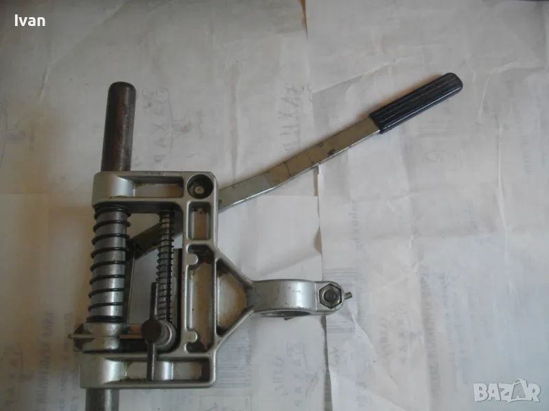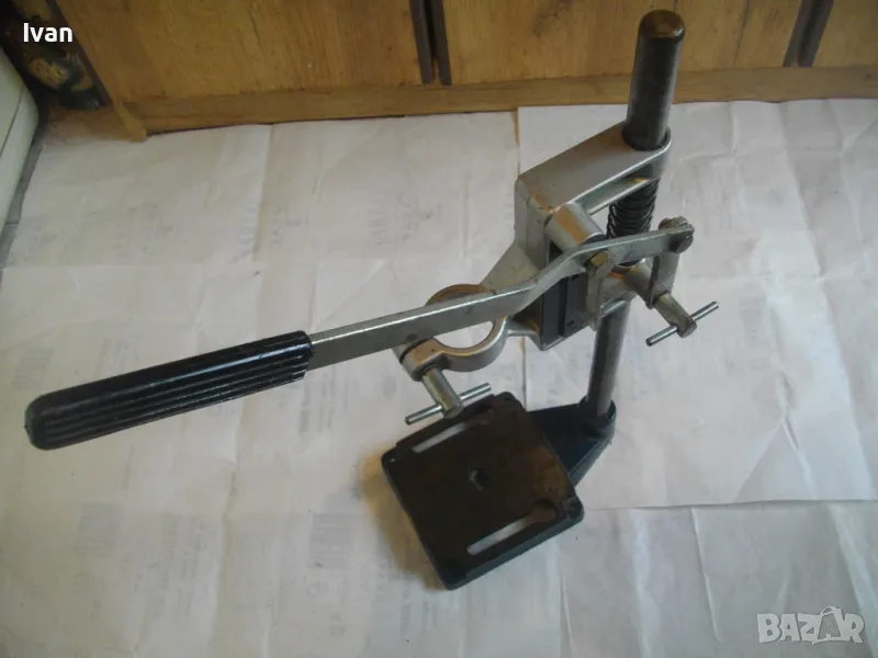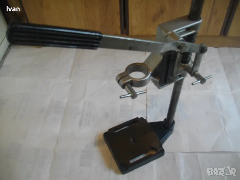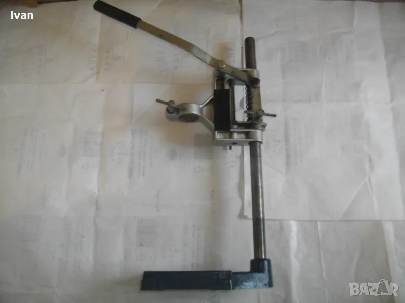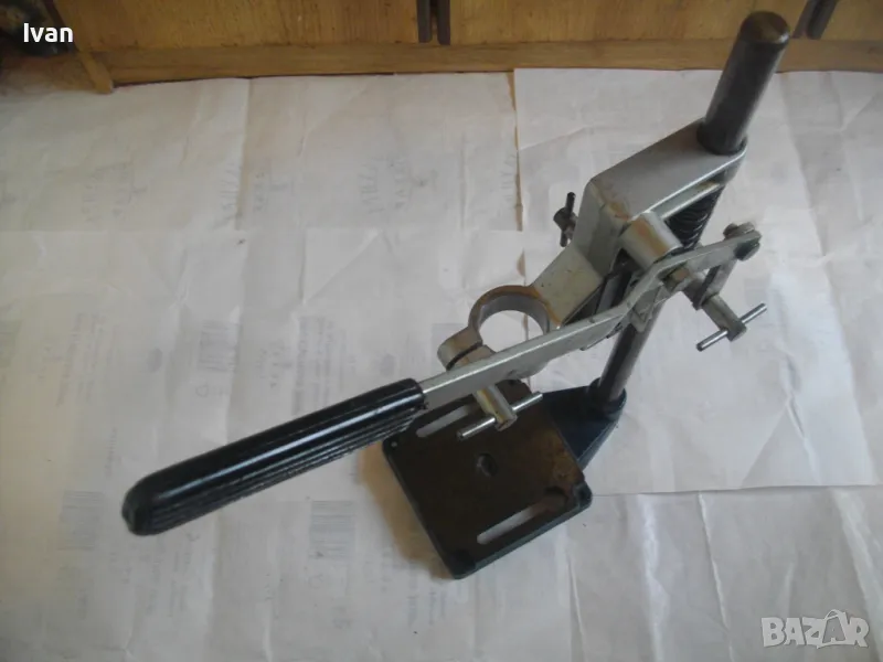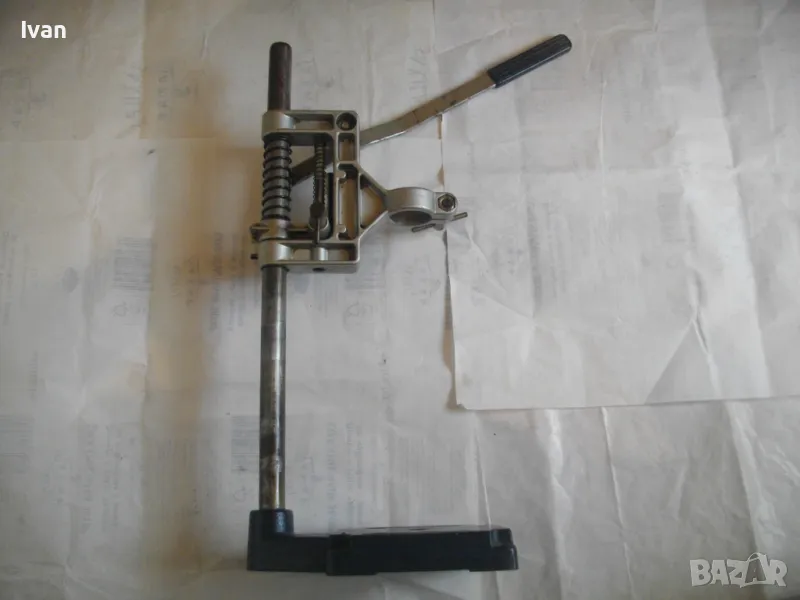 ОПИСАНИЕ на масивна професионална стойка за бормашина АЕГЕ. Марка и модел - AEG BST 707. Старо висококачествено производство на Запазна Германия - малркирано на стойката - Made in West Germany.Стойката е като нова /или съвсем нова и неизползвана или много малко ползвана, без видими следи от употреба и притягане на бормашина в нея/. Отлично техническо състояние. Без забележки. Голям работен ход - 0-70 мм. Долна основа - масивна стоманена 160 х 160 мм. Височина на стойката - 58 см. Тръба метална масивна ф 25 мм, куха за придвижване на главата. Глава и корпус на стойката - алуминиеви. Кръг за поставяне на бормашина - универсален ф 43 мм. Хода и височината на главата са регулируеми по дължината на основанта тръба. Масивна метална дръжка със стегнат пружинен механизъм. Тегло на стойката от обявата - 6,0 кг. Цена - 199 лв.