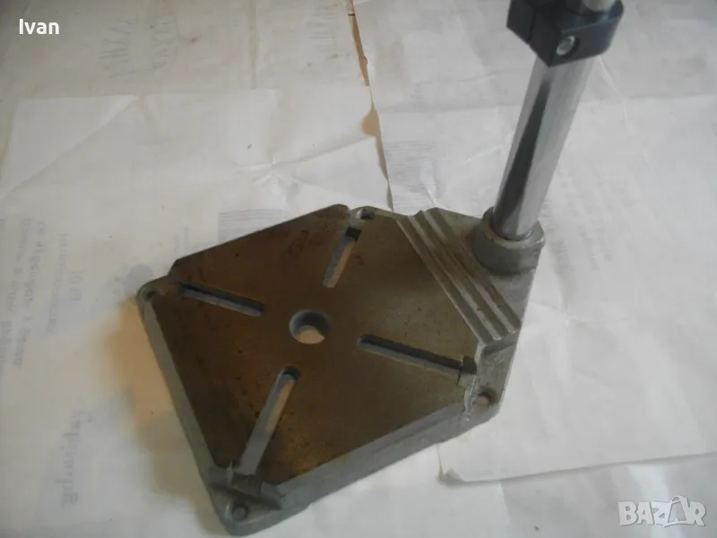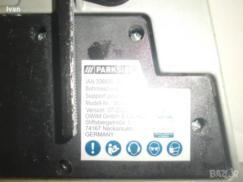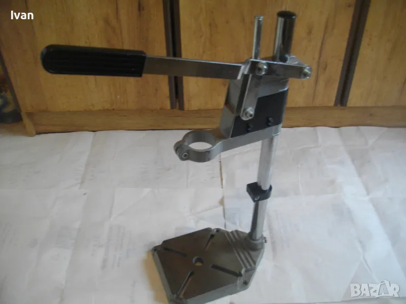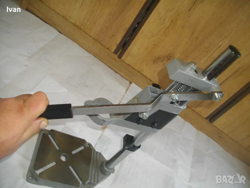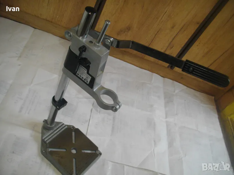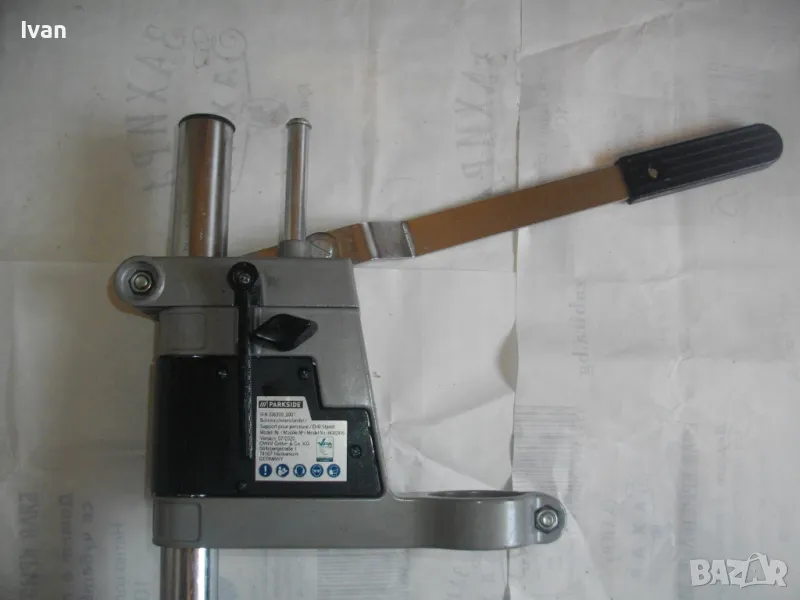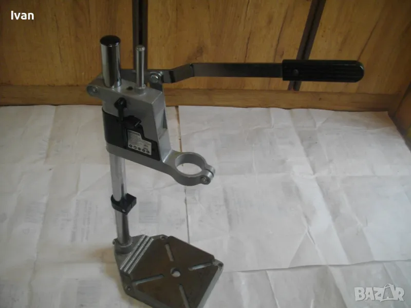 ОПИСАНИЕ на нова немска стойка сива за бормашина, модел на Парксайт - 3,0 кг/ход 60 мм - цена 99 лв. ОПИСАНИЕ на стойка за бормашина - 129 лв.. Съвсем нова ,неизползвана и неупотребявана. Без включено менгеме. Марка и модел - Parkside 364704. Немско оригинално производство - GERMANY - 2001 г. Универсален захват - кръг диаметър 43 мм. ОТЛИЧНО техническо8работно състояни ена стойката. Работен ход 60 мм. Височина 50,5 см. Ширина с дръжката - 36 см. Долната основа е чугунена с размери 160 х 190 мм. Тегло на стойката - 3,0 кг. Описание на стойкато от линкове: За прецизно пробиване напр. дърво, метал или пластмаса