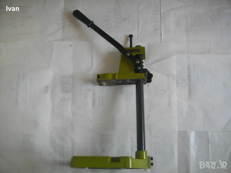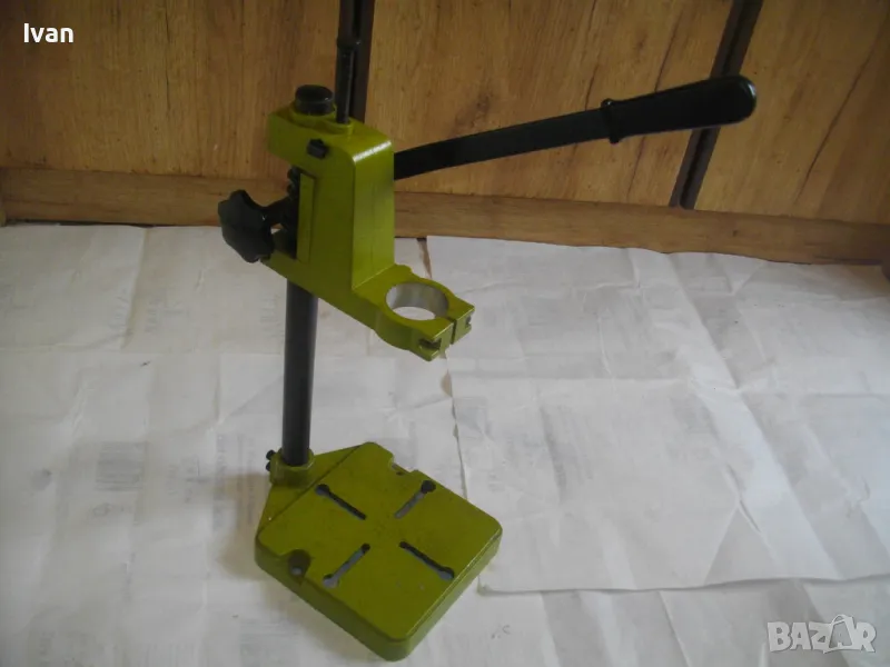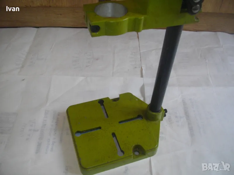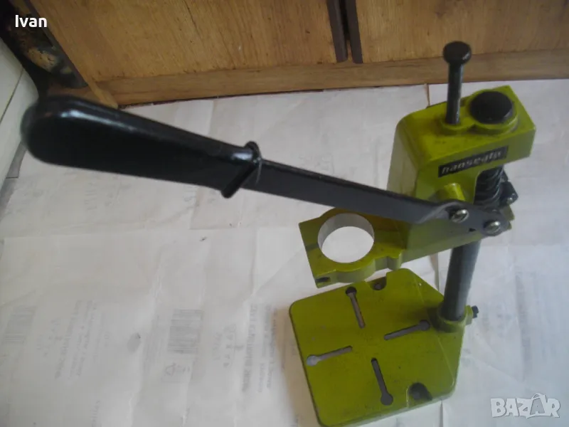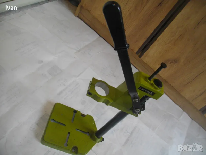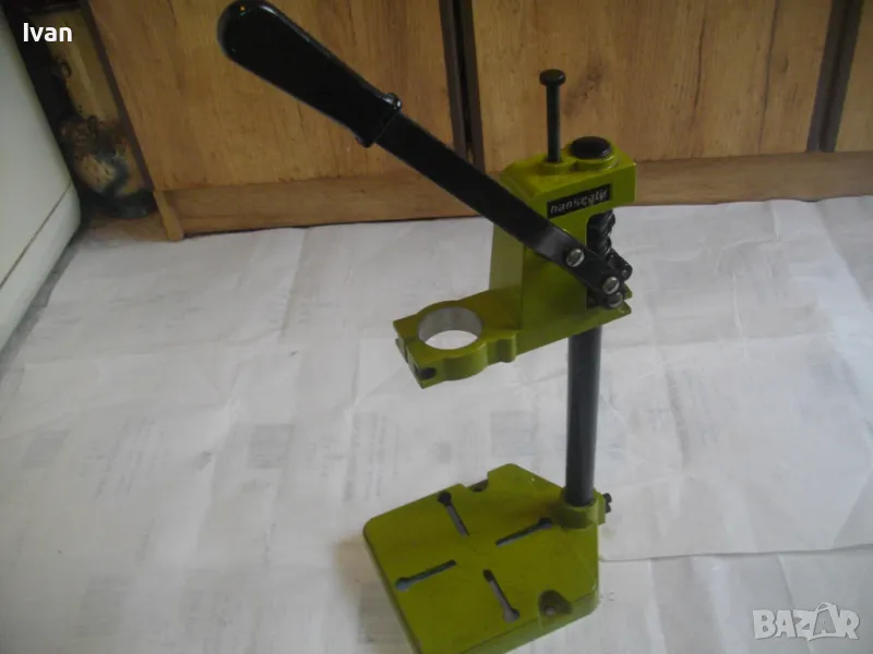 ОПИСАНИЕ на нова немска зелена алуминиева олекотена стойка за бормашина, професионална на HANSEATIC - тегло 2,0 кг, работен ход 60 мм - цена 159 лв. ОПИСАНИЕ на стойка за бормашина - 159 лв. Нова, неизползвана, Олекотена, алуминиева. Немска професионална марка HANSEATIC. Кръг за поставяне на бормашина - стандартен ф 43 мм. Алумин основа с размери 165 х 165 мм, алумин глава, тръба от закалена индустиална стомана ф 25 мм Работен ход регулируем до 55-60 мм. Регула;ция на височината на главата. Височина на стойката - 44 см, тегло - 2,000 кг.