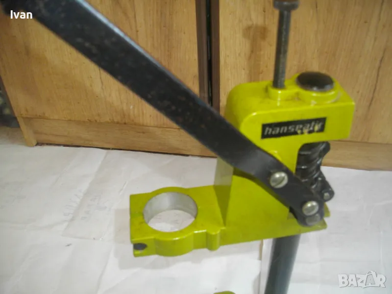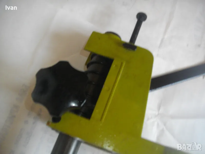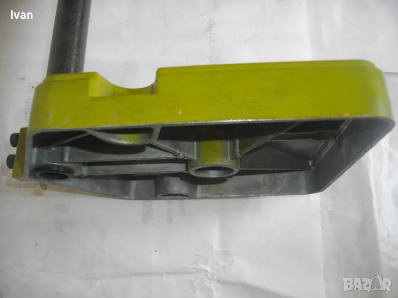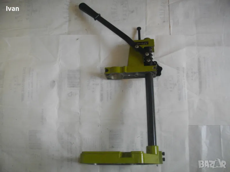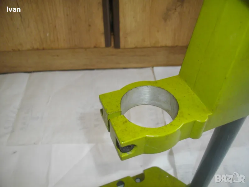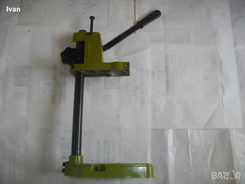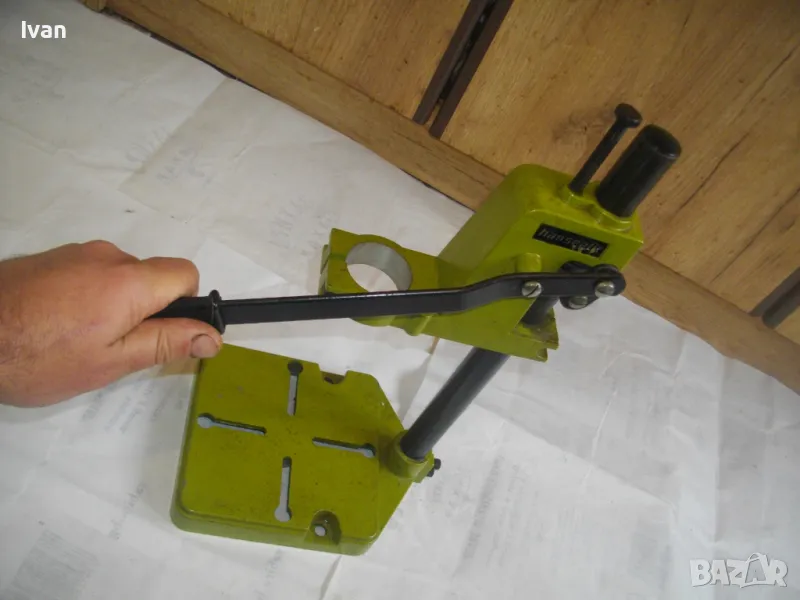 ОПИСАНИЕ на нова немска зелена алуминиева олекотена стойка за бормашина, професионална на HANSEATIC - тегло 2,0 кг, работен ход 60 мм - цена 159 лв. ОПИСАНИЕ на стойка за бормашина - 159 лв. Нова, неизползвана, Олекотена, алуминиева. Немска професионална марка HANSEATIC. Кръг за поставяне на бормашина - стандартен ф 43 мм. Алумин основа с размери 165 х 165 мм, алумин глава, тръба от закалена индустиална стомана ф 25 мм Работен ход регулируем до 55-60 мм. Регула;ция на височината на главата. Височина на стойката - 44 см, тегло - 2,000 кг.