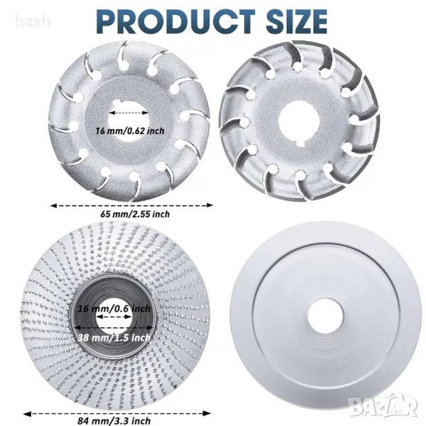 - Материал и размер: Ъглошлифовъчният диск е изработен от волфрамов карбид и не се чупи или деформира лесно поради здравата си конструкция. Външният диаметър на шлифовъчния диск е прибл. 84 mm, а диаметърът на отвора е приблизително 16 mm; дискът за дърворезба е изработен от манганова стомана и двата режещи диска могат да ви служат дълго време.