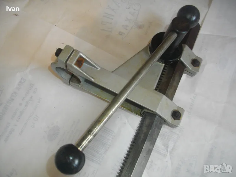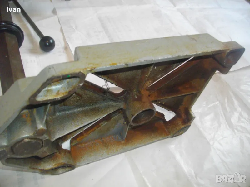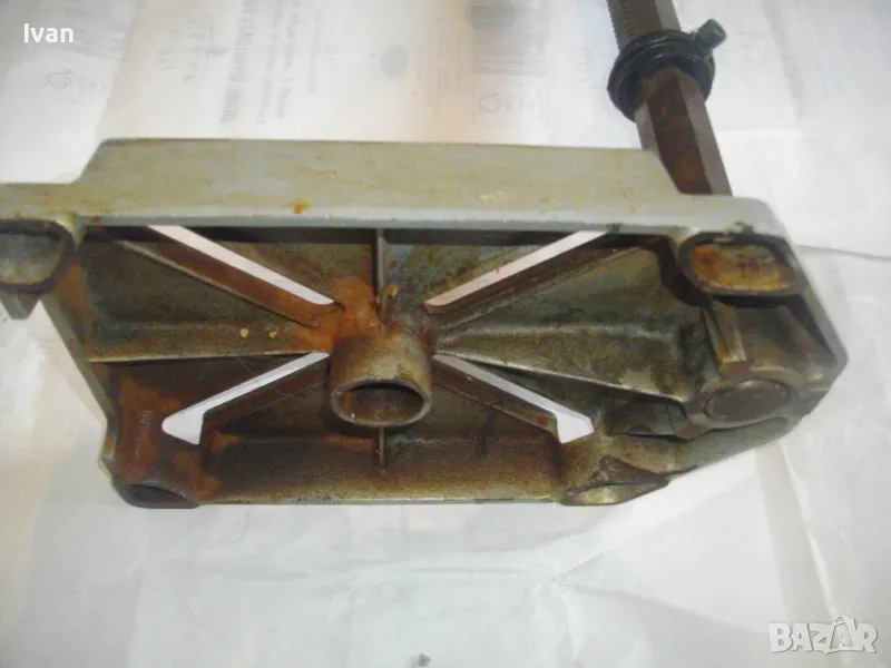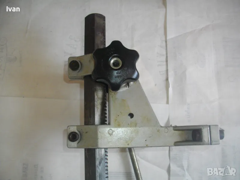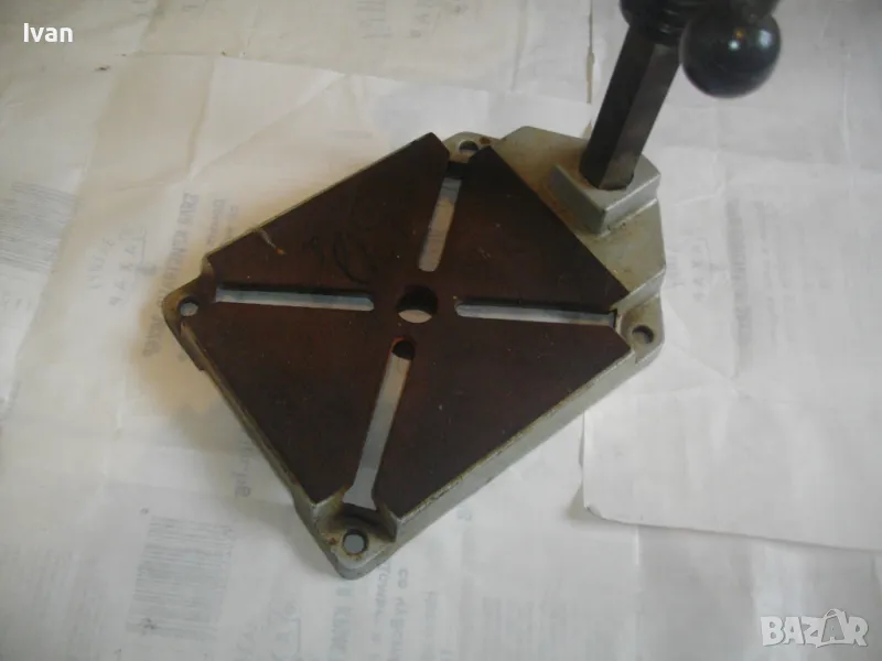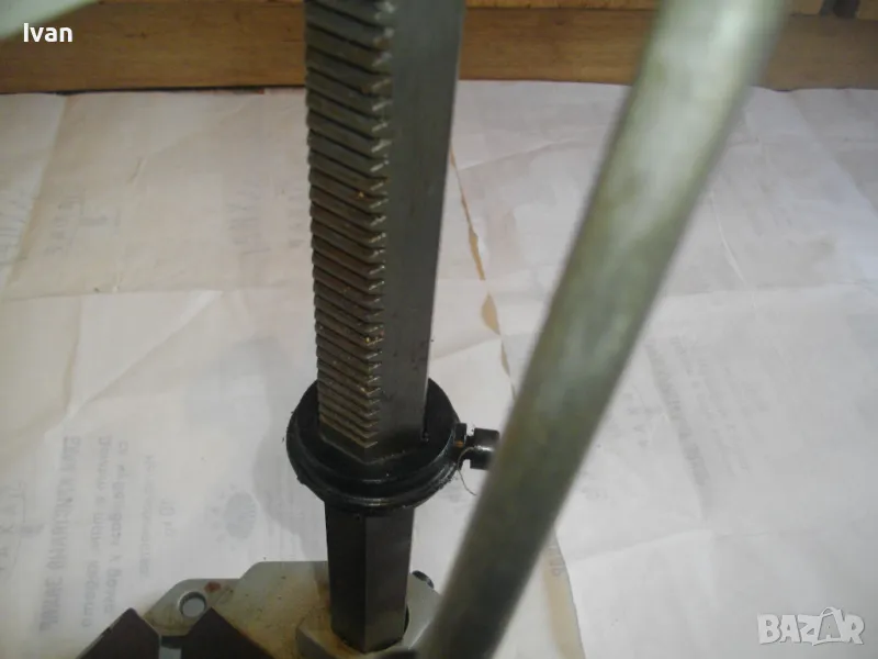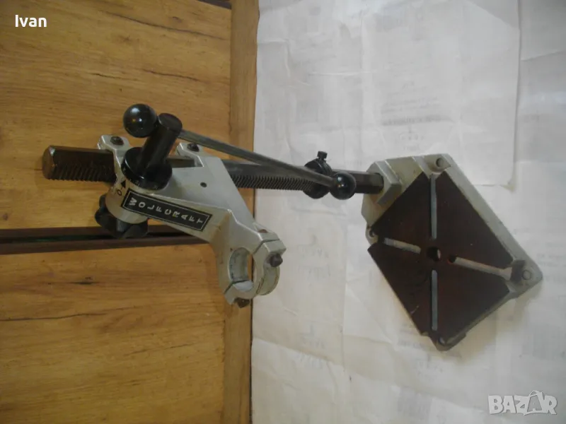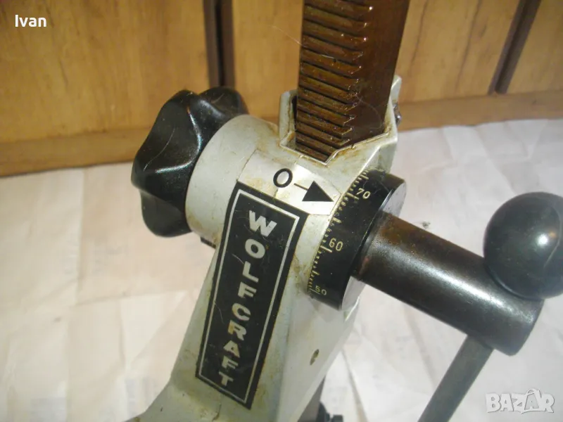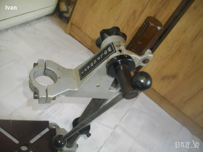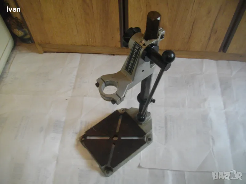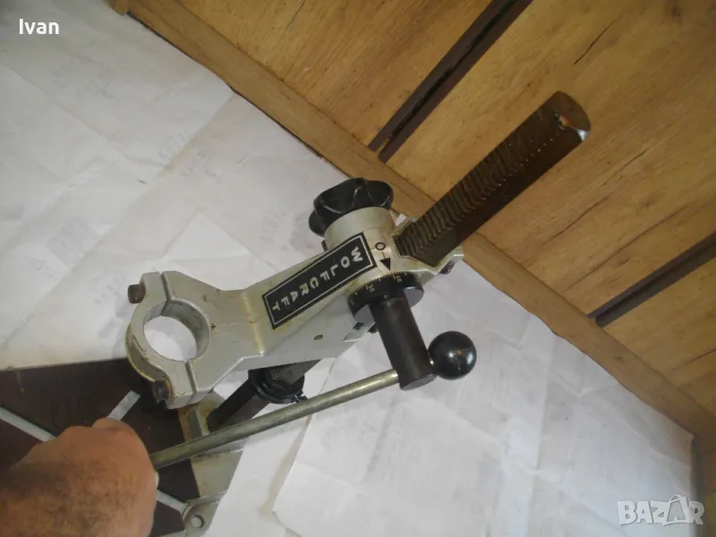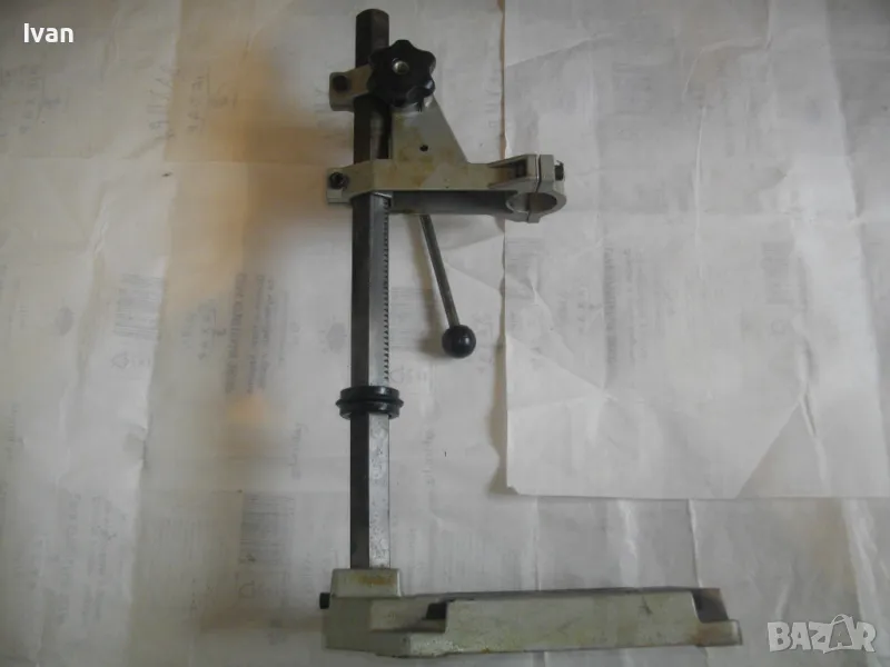 ОПИСАНИЕ на сива голяма стойка за бормашина с оребрена водеща тръба на хода - неемска старо качество и производство ФРГ - масивна 8,0 кг/работен ход 85 мм - цена 199 лв. ОПИСАНИЕ на стойка WOLCRAFT с ход 85 мм - цена 199 лв. Немска професионална. Нова ,неизползвана и неупотрубявана. Голям работен ход - до 85 мм, регулируем. Височина на стойката - 550 мм. Долна основа масивна желязна с прорези за захват на менгеме и захват към работна маса. Размери на основата - 275 х 195 мм. Дебела оребрена тръха плътна ф 30 мм. за придвижване на височината и хода. Две масивни врътки бакелитови за регулация ход. Глава - алуминиева с кръг универсален размер за захват на бормашина ф 43 мм. Тегло на стойката - 8,0 кг. Цена 199 лв