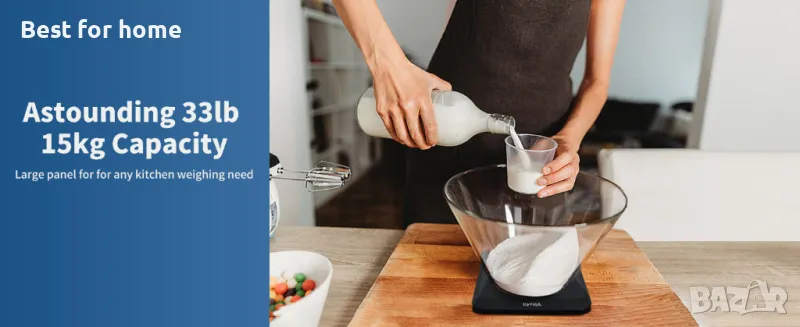 Кухненската везна има удивителен капацитет до 33lbs / 15kg и минимално тегло 3g, измерено в 1g точна стъпка, показване на резултатите от измерването в g,kg,oz и lb:oz.