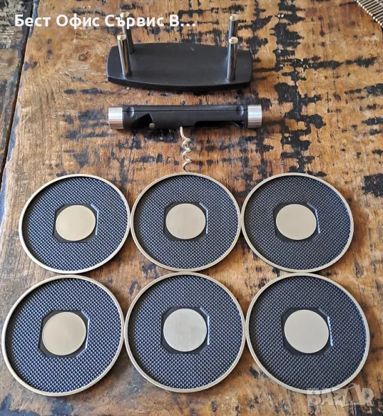Продавам комплект подложки за чаши Henkels Хенкелс Германия Aachen Germany Design, 6 броя подложки с отварачка за бутилки и тирбушон . Произведено в Германия. Изработен е от пластмаса и метал. Размер на подложките: 9 см диаметър, тирбушонът е с размер 13,2 см дължина и 2 см диаметър. Размер на целия комплект 13.5х9х5.8 см. В оригиналната кутия, която не е в перфектно състояние. Кутията е с размери 15.5х11.2х6.7 см. Комплектът е чисто нов, не е използван. Уникат за ценители. Имам 2 броя. Цената е за 1 брой.