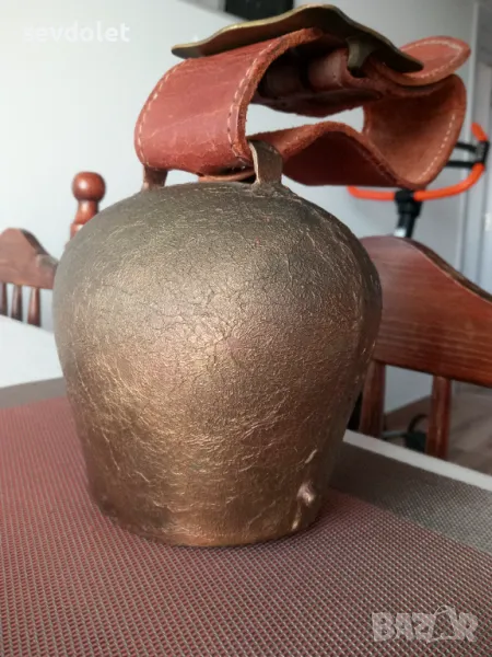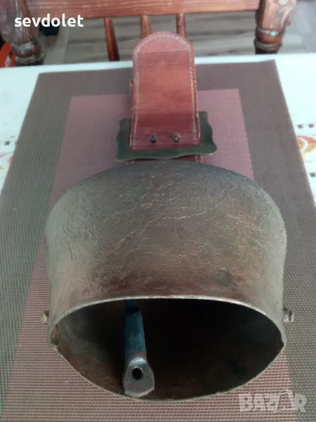 Голям ,антикварен клопот(чан).Материал-Черно(не е мед-бакър).Германия.Ръчна и стилна изработка.Маркиран.Неповторим силен,чист и плътен звук.В отлично състояние!