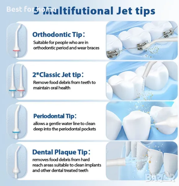 5 струйни накрайника и 3 режима Безжичният конец за вода YOOY е оборудван с 5 струйни накрайника и различни режими на воден поток. Номиналните и меките пили са режими на директно пръскане с различни налягания, които могат да почистват чувствителните зъби и да масажират чувствителните венци. Импулсният файл е режим на импулсна струя, който почиства зъбите в дълбочина и стимулира и масажира венците за всички ваши нужди от грижа за устната кухина. Децата също могат да го използват.