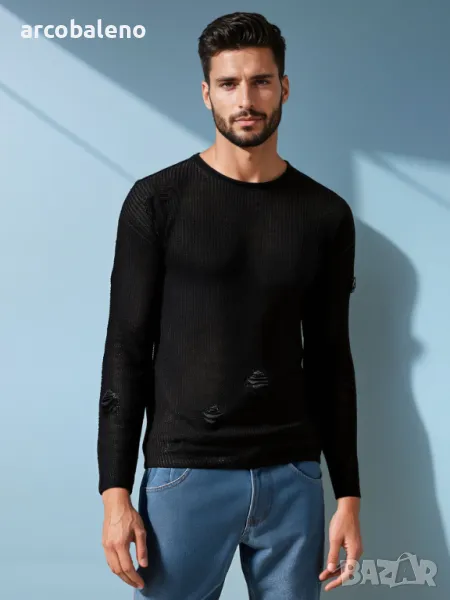 Оригинален мъжки пуловер с фини ожулвания, които му придават отличителен характер. Изработена от мека материя, идеална за ежедневен стил. Това е перфектен избор за ежедневна употреба, когато искате да комбинирате комфорт с модерен външен вид.