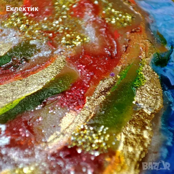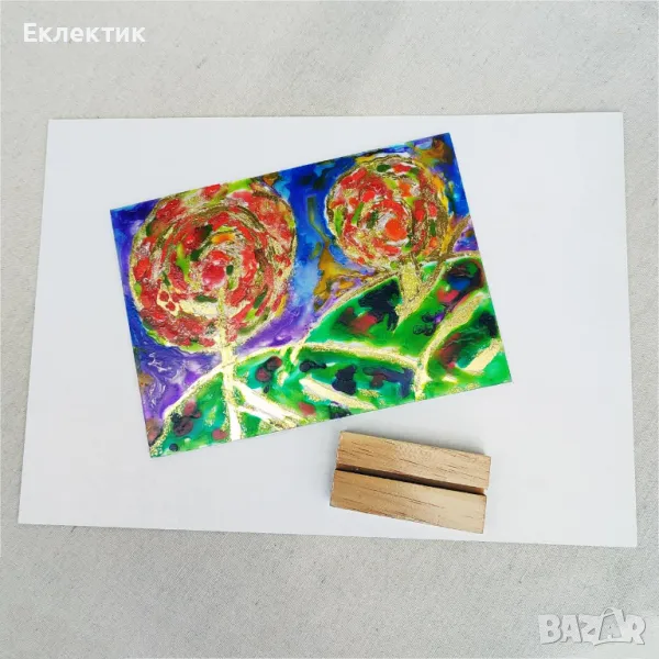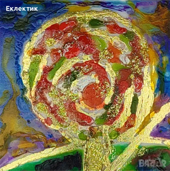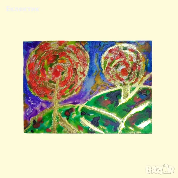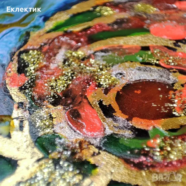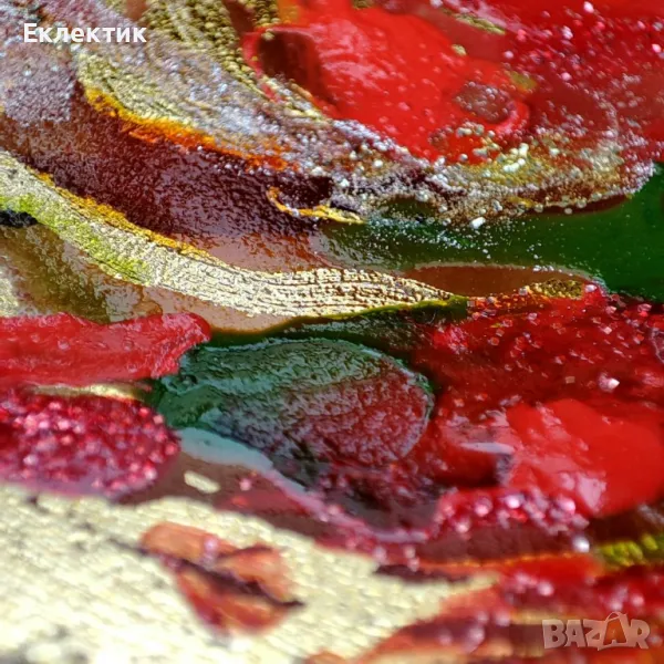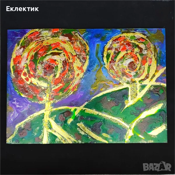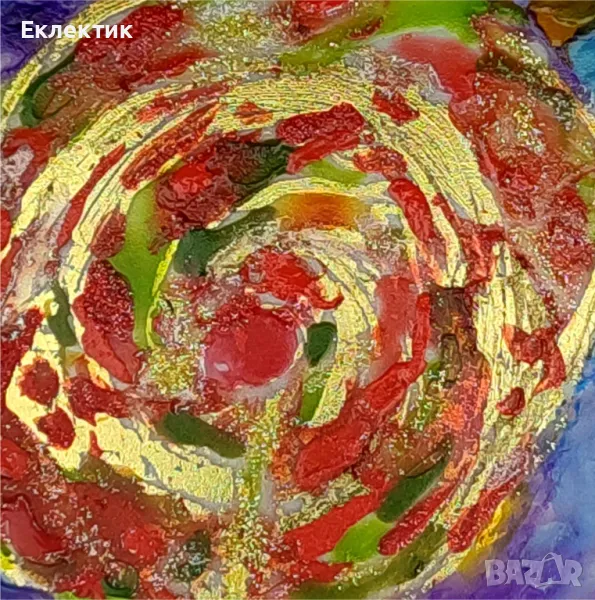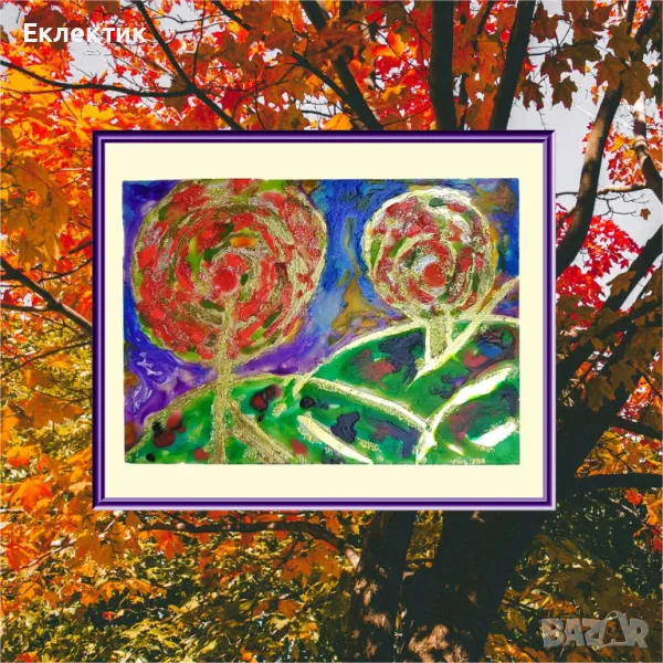 Вдъхновено от цветовете на есента, това пано използва различни акрилни бои и златно фолио върху стъклен панел с дебелина 2 mm. Размерът е 13 x 18 cm. Предлага се с обикновена дървена стойка и може да се постави на всяка плоска повърхност в дома или офиса.