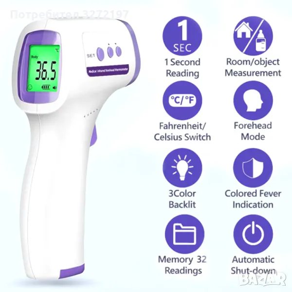 - Цифров термометър за чело, безконтактен инфрачервен медицински термометър, инструмент за измерване на телесната температура и треска за бебета и възрастни