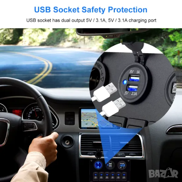 Използвайки високоефективен стабилен IC, стабилен изходен ток, двойно USB зарядно за кола и гнездо за запалка,